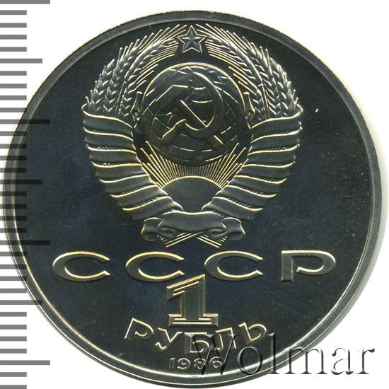 Сверху герб СССР с 15 витками ленты, под ним буквы «СССР», ниже обозначение достоинства монеты цифра «1» и ниже слово «РУБЛЬ», внизу у канта год выпуска монеты «1986».