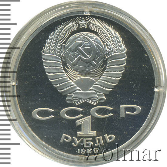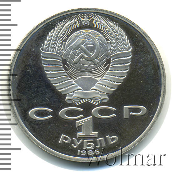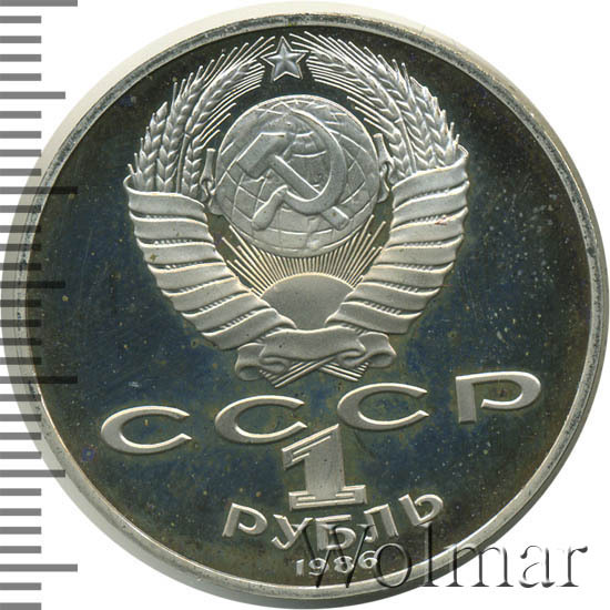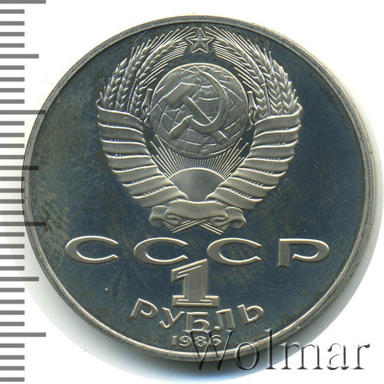 Сверху герб СССР с 15 витками ленты, под ним буквы «СССР», ниже обозначение достоинства монеты цифра «1» и ниже слово «РУБЛЬ», внизу у канта год выпуска монеты «1986».