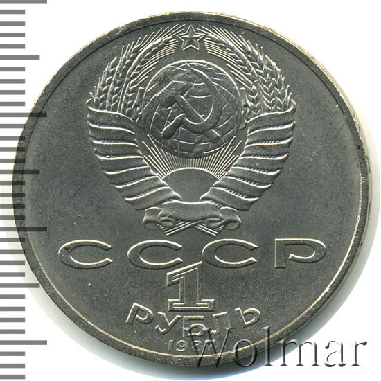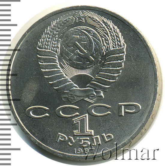 Сверху герб СССР с 15 витками ленты, под ним буквы «СССР», ниже обозначение достоинства монеты цифра «1» и ниже слово «РУБЛЬ», внизу у канта год выпуска монеты «1987».