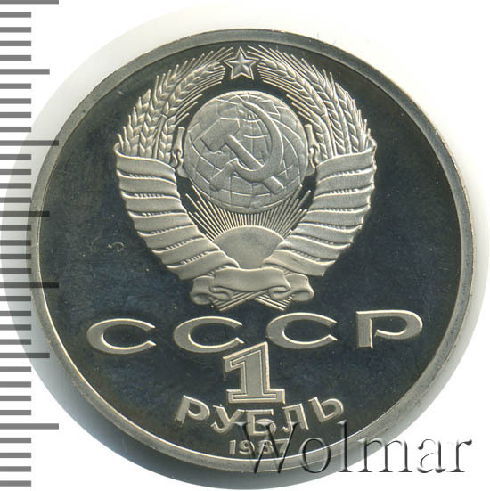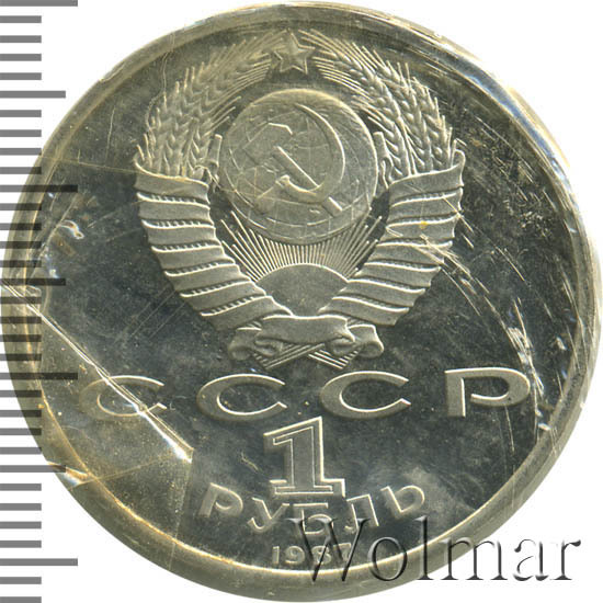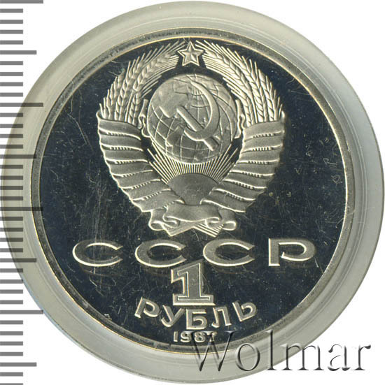 Сверху герб СССР с 15 витками ленты, под ним буквы «СССР», ниже обозначение достоинства монеты цифра «1» и ниже слово «РУБЛЬ», внизу у канта год выпуска монеты «1987».