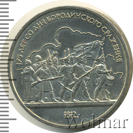 В 1987 году, помимо годовщины 70-ти летия Октября, в нашей стране отмечалась ещё одна значимая историческая дата. 175 лет назад в 120 км от Москвы произошла Бородинская битва, крупнейшее и кровопролитнейшее сражение войны 1812г. К этому событию было отчеканено две юбилейные монеты, номиналом в 1 рубль, именуемые на сленге нумизматов: "барельеф" и "обелиск". На первом рубле на поле реверса находятся изображения не только солдат русской армии, но и ополченцев и партизан, что отражает поистине отечественный, народный характер этой войны. В 2012 году центробанк в лице монетного двора порадовал нас, коллекционеров, целой серией из 28 монет, посвящённых 200-летию победы в Отечественной войне над наполеоновской армией.