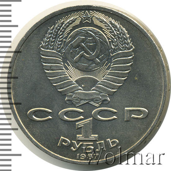 Сверху герб СССР с 15 витками ленты, под ним буквы «СССР», ниже обозначение достоинства монеты цифра «1» и ниже слово «РУБЛЬ», внизу у канта год выпуска монеты «1987».