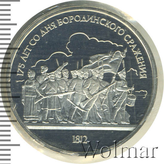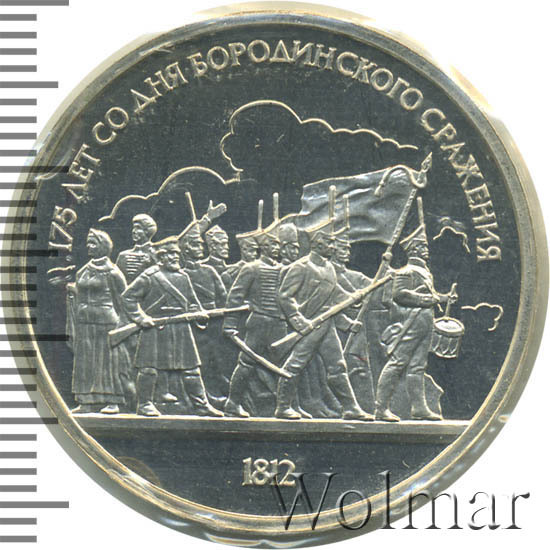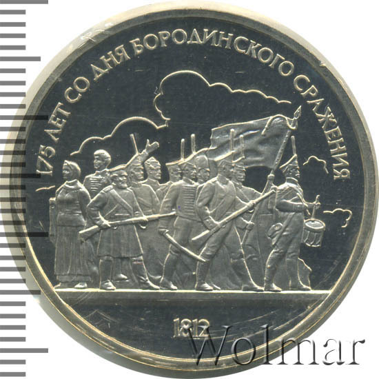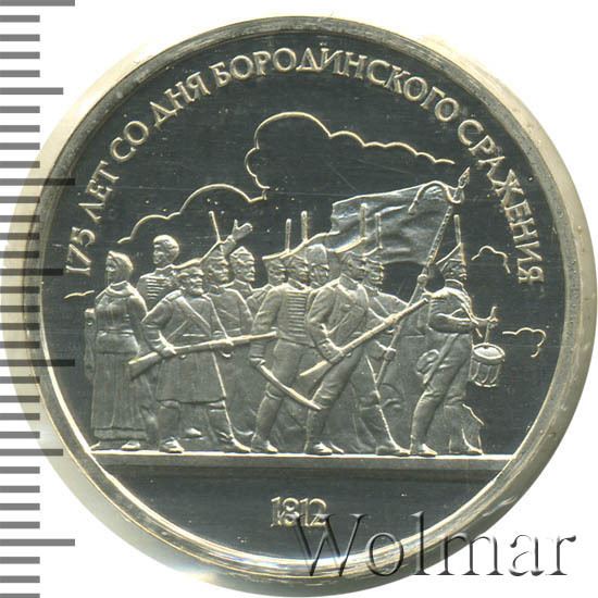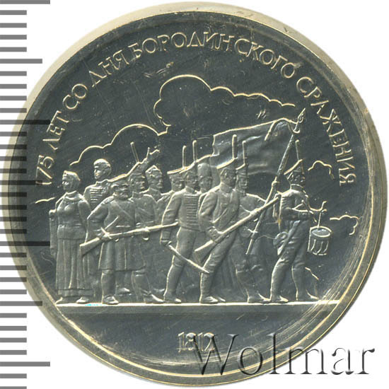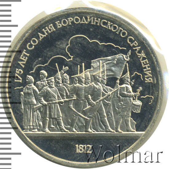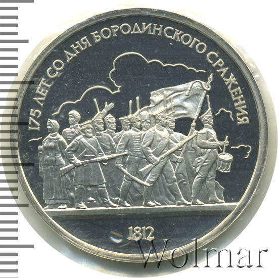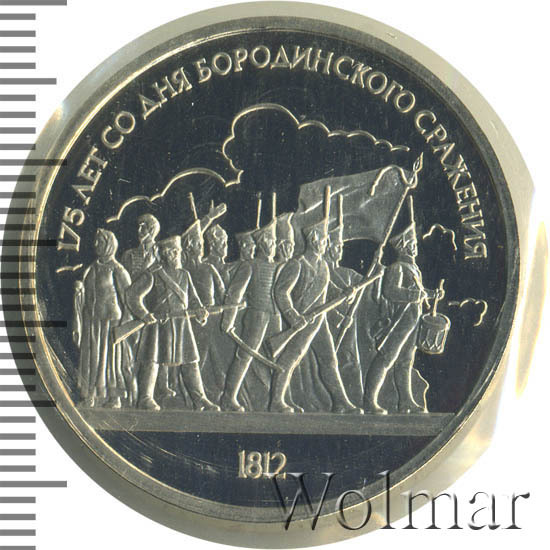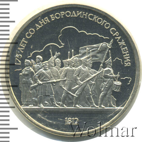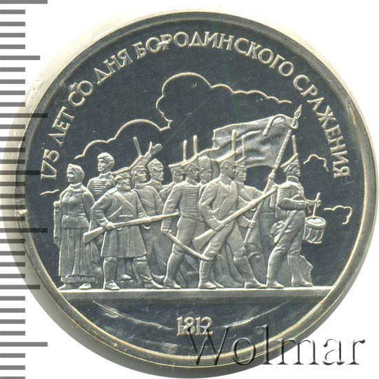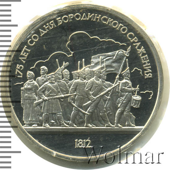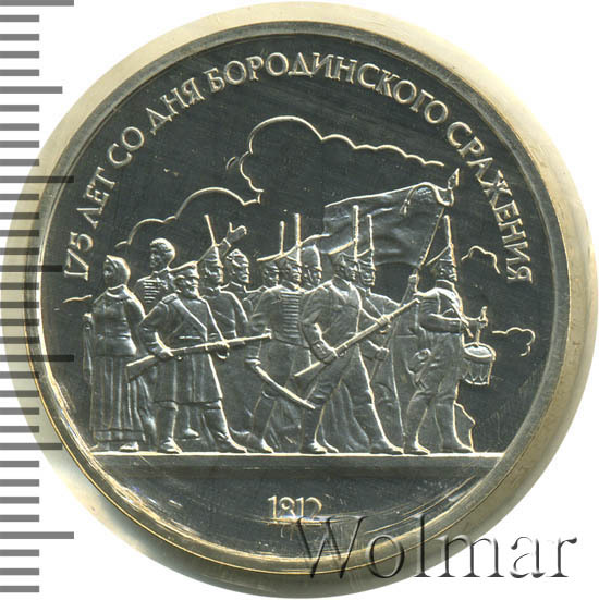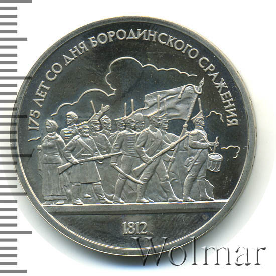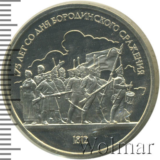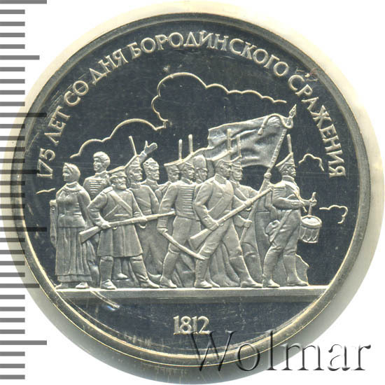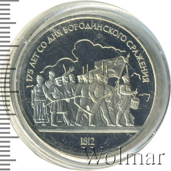 1 рубль 1987, посвященный 175-ти летию победы в Бородинском сражении, был изготовлен специально для коллекционеров в качестве Proof. Данная технология предполагает чеканку улучшенными полированными штемпелями на зеркальном поле монеты матового рельефа с высокой чёткостью самых мелких деталей рисунка. На реверсе рубля находятся изображения не только солдат русской армии, но и ополченцев и партизан, что отражает поистине отечественный, народный характер этой войны.