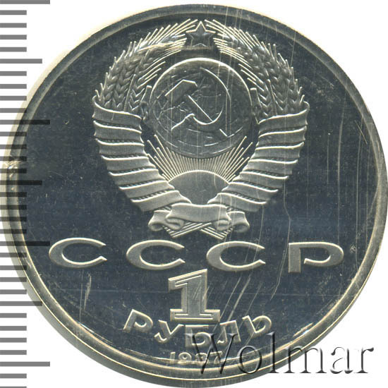 Сверху герб СССР с 15 витками ленты, под ним буквы «СССР», ниже обозначение достоинства монеты цифра «1» и ниже слово «РУБЛЬ», внизу у канта год выпуска монеты «1987».