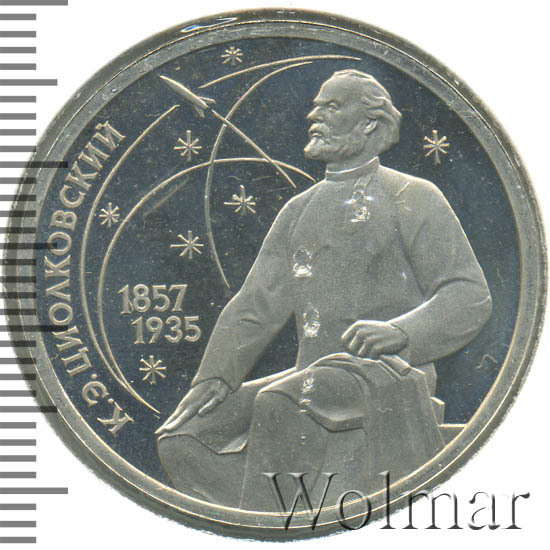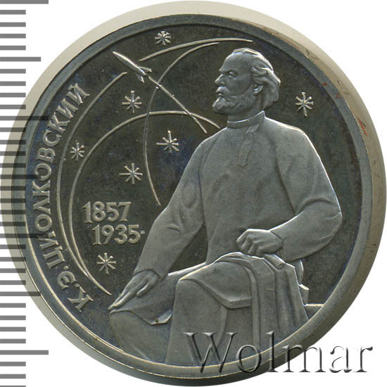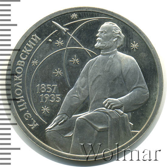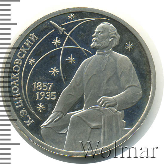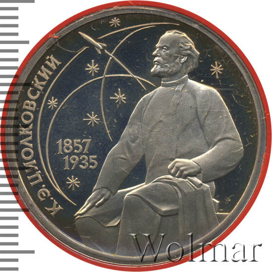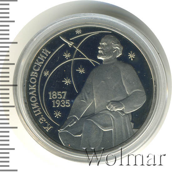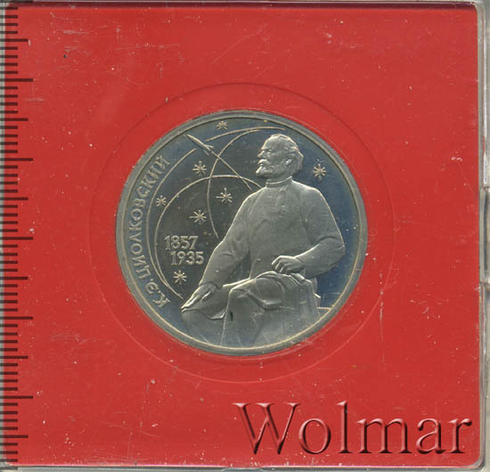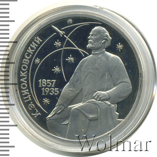 К.Э. Циолковский по праву считается одним из отцов-основателей отечественной ракетной техники и космонавтики, к 130-летию со дня его рождения была выпущена юбилейная монета 1 рубль специальным тиражом в 170 тысяч экземпляров в улучшенном качестве Proof. Данная технология предполагает чеканку улучшенными полированными штемпелями на зеркальном поле монеты матового рельефа с высокой чёткостью самых мелких деталей рисунка. Поскольку зеркальный пруф предназначен именно для специалистов-нумизматов, монеты подобного качества требуют особо аккуратного обращения. Испортить пруф очень легко, достаточно просто взять монетку голыми пальцами без перчаток. Хранят такие изделия, как правило, в специальных капсулах или холдерах.