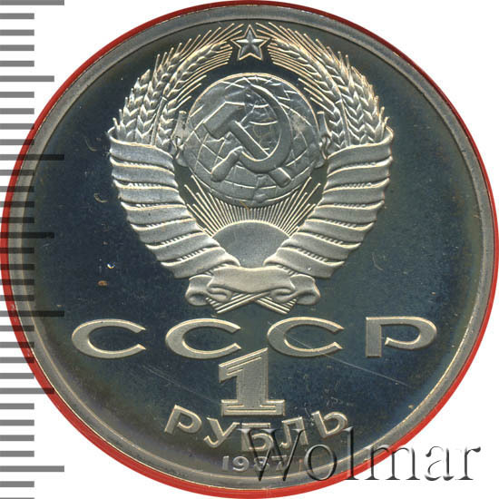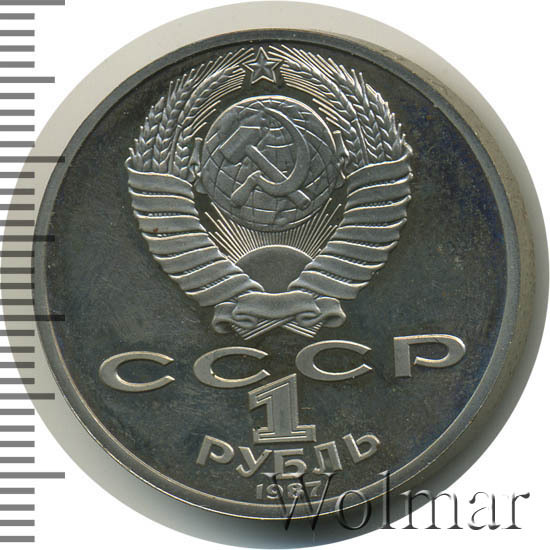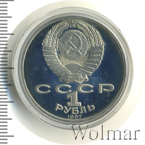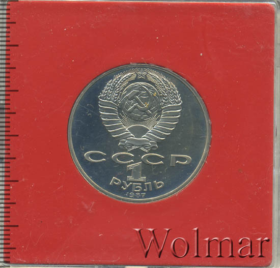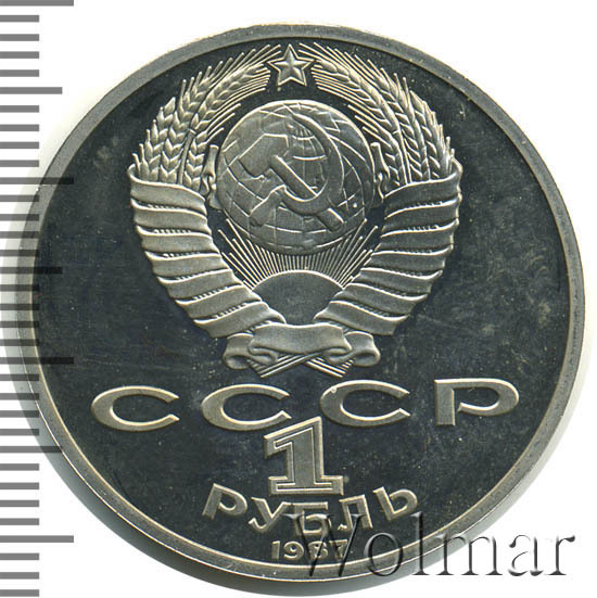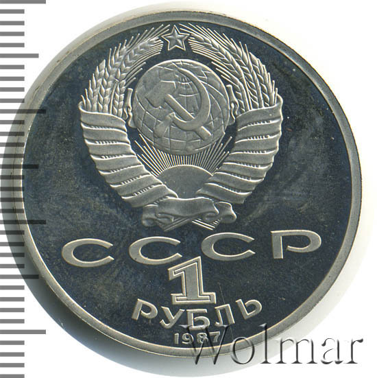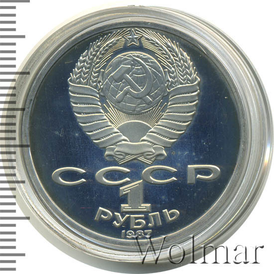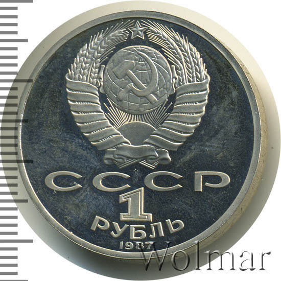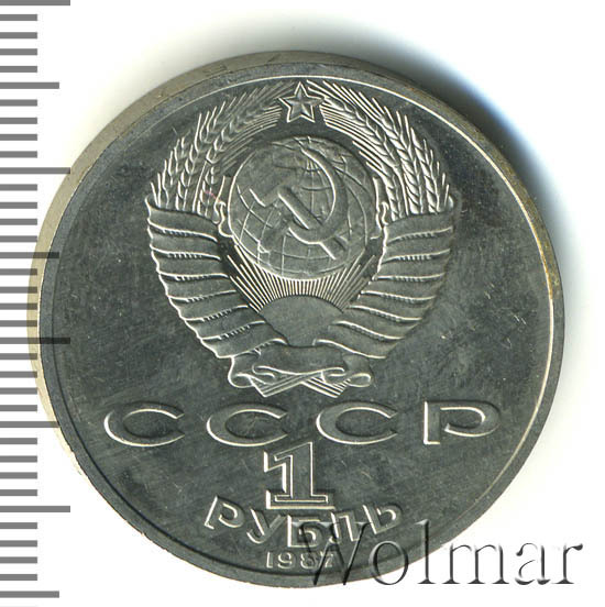 Сверху герб СССР с 15 витками ленты, под ним буквы «СССР», ниже обозначение достоинства монеты цифра «1» и ниже слово «РУБЛЬ», внизу у канта год выпуска монеты «1987».