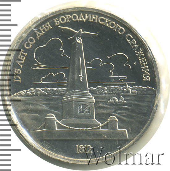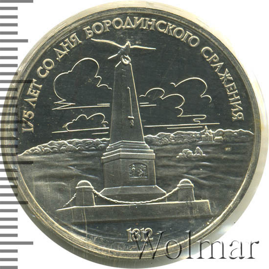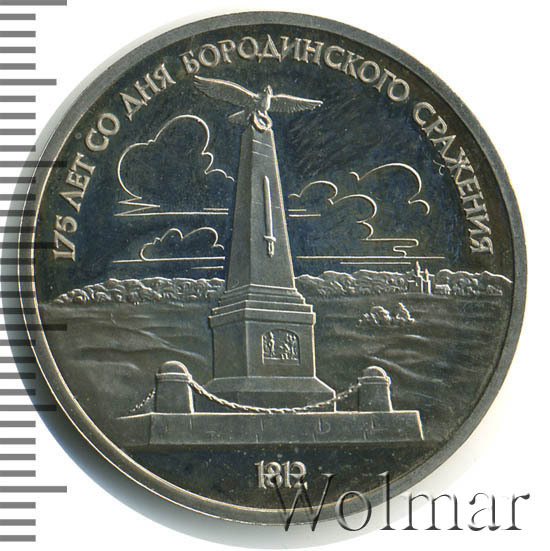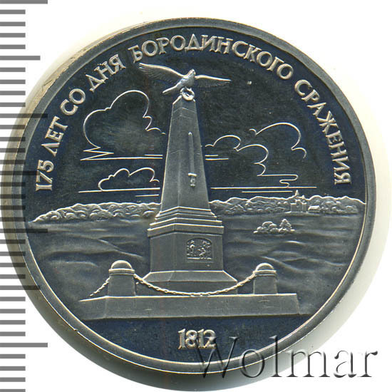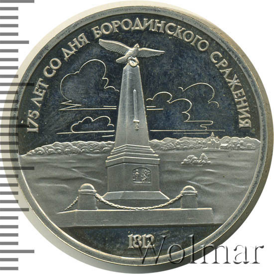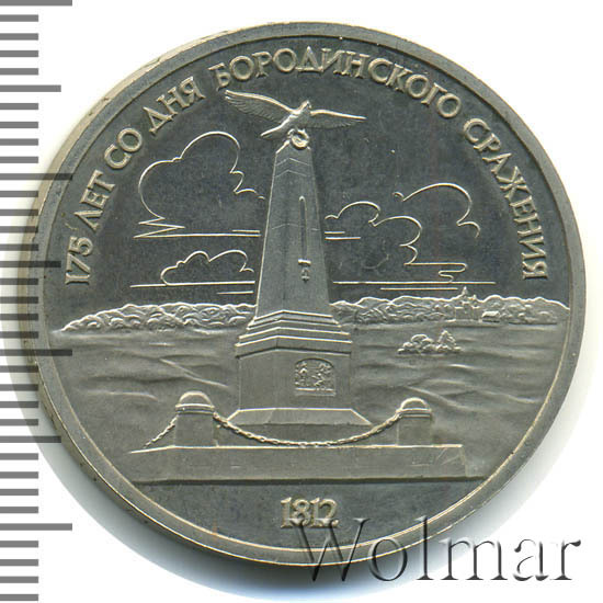 1 рубль 1987, посвященный 175-ти летию победы в Бородинском сражении, был изготовлен специально для коллекционеров в качестве Proof. Данная технология предполагает чеканку улучшенными полированными штемпелями на зеркальном поле монеты матового рельефа с высокой чёткостью самых мелких деталей рисунка. На реверсе рубля находится изображение памятника-стеллы, расположенного на поле битвы, в том месте где находилась ставка знаменитого отечественного полководца Михаила Илларионовича Кутузова.