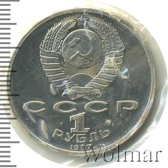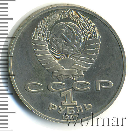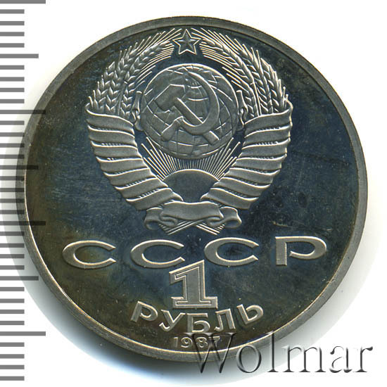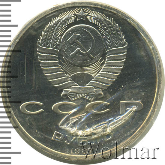 Сверху герб СССР с 15 витками ленты, под ним буквы «СССР», ниже обозначение достоинства монеты цифра «1» и ниже слово «РУБЛЬ», внизу у канта год выпуска монеты «1987».