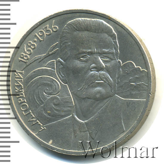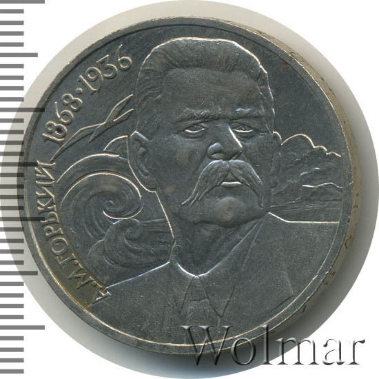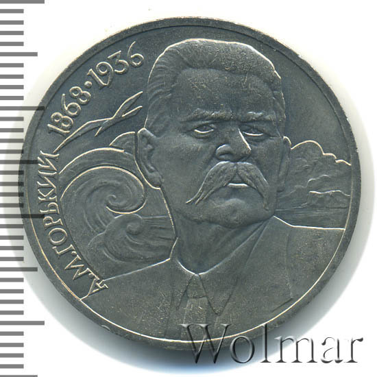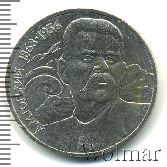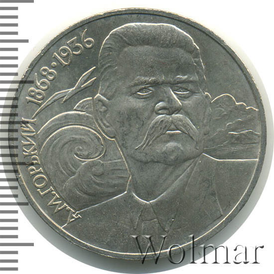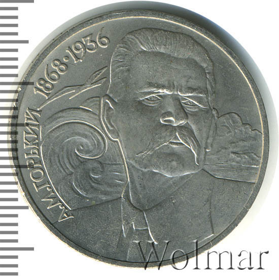 К 120-ти летию писателя Максима Горького Госбанк СССР выпустил юбилейную монету номиналом в 1 рубль, тиражом около 4 млн. экземпляров, 200 тыс. из которых были отчеканены в улучшенном качестве Proof. Максим Горький - это псевдоним классика отечественной литературы Алексея Максимовича Пешкова. Его произведения были идейно близки социал-демократам и революционерам. После Гражданской войны Горький эмигрирует за рубеж и возвращается только в 1932 году по приглашению И.В.Сталина и проводит I союзный съезд писателей. 5 раз он был номинирован на нобелевскую премию по литературе. Город Нижний Новгород с 1932 по 1990 носил название Горький, а количество улиц и проспектов в нашей стране, названных в честь писателя превышает две тысячи!
