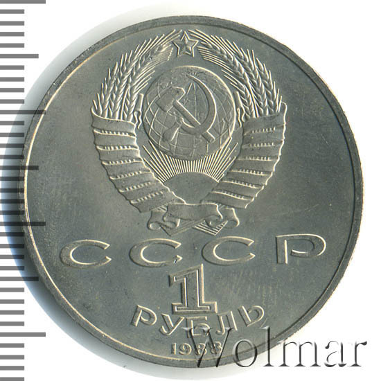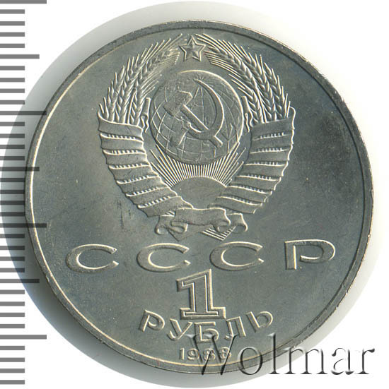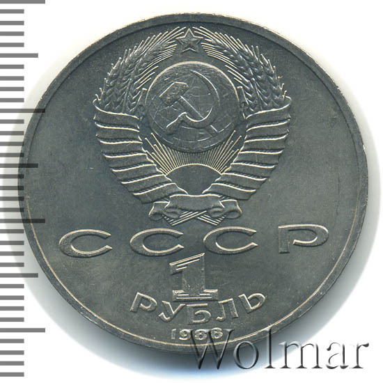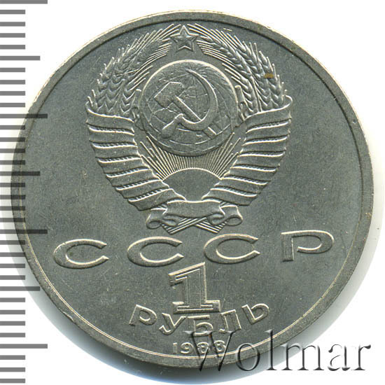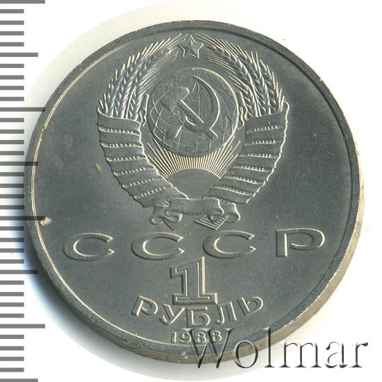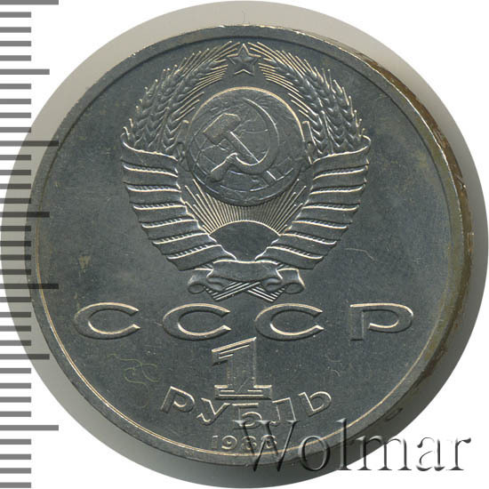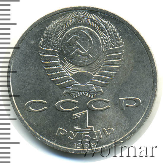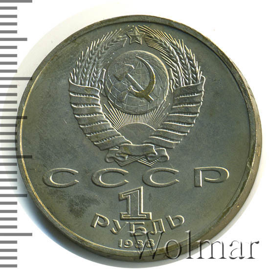 Сверху герб СССР с 15 витками ленты, под ним буквы «СССР», ниже обозначение достоинства монеты цифра «1» и ниже слово «РУБЛЬ», внизу у канта год выпуска монеты «1988».