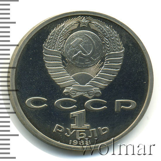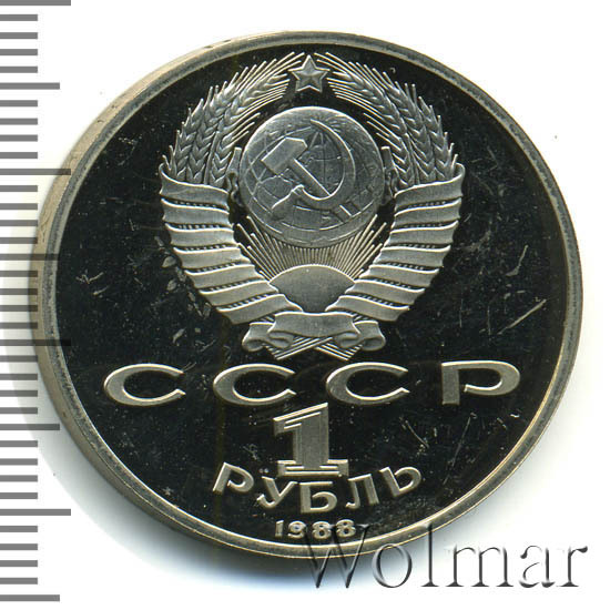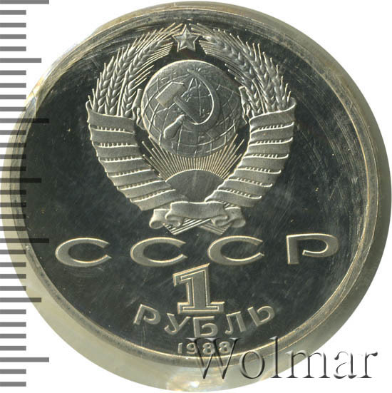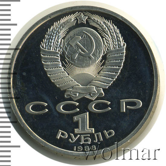Сверху герб СССР с 15 витками ленты, под ним буквы «СССР», ниже обозначение достоинства монеты цифра «1» и ниже слово «РУБЛЬ», внизу у канта год выпуска монеты «1988».