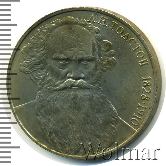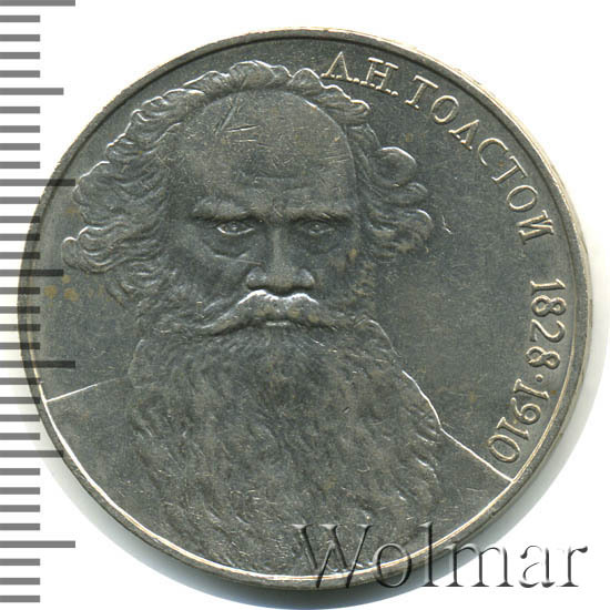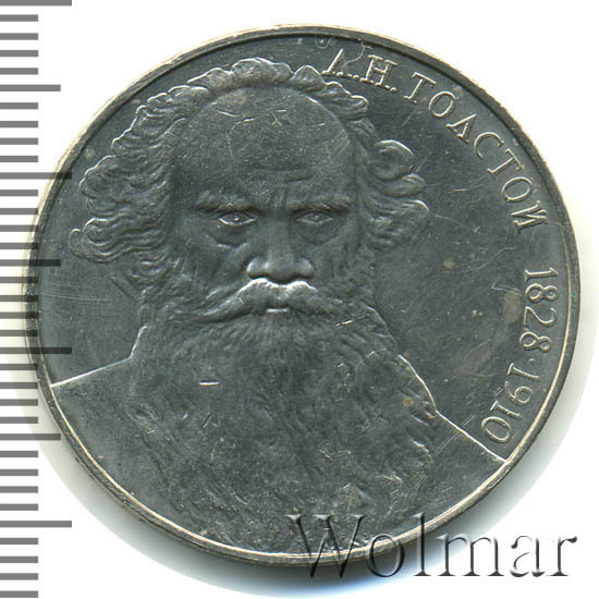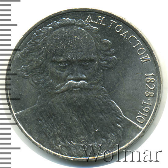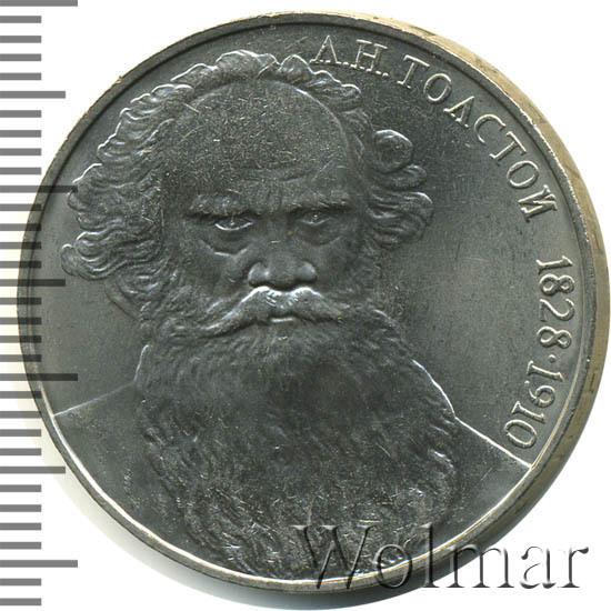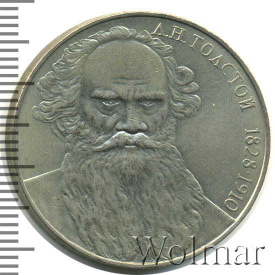 К 160ти летию писателя Льва Николаевича Толстого Госбанк СССР выпустил юбилейную монету номиналом в 1 рубль, тиражом около 4 млн. экземпляров, 200 тыс. из которых были отчеканены в улучшенном качестве Proof. Толстой по праву считается классиком не только отечественной, но и мировой литературы. Он широко известен в Европе и Штатах как великий русский мыслитель, просветитель и гуманист своей эпохи, автор романов "Война и мир " и "Анна Каренина". Стоит ли говорить, что ещё при жизни писатель был номинирован на нобелевскую премию по литературе 16 раз и 4 раза на нобелевскую премию мира..