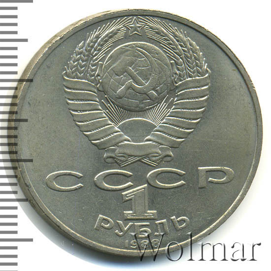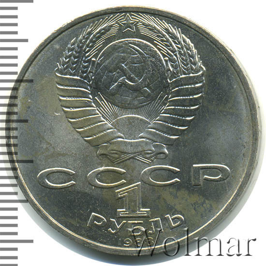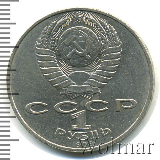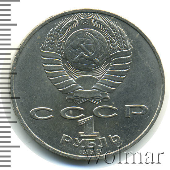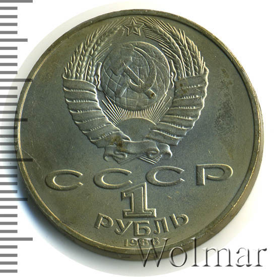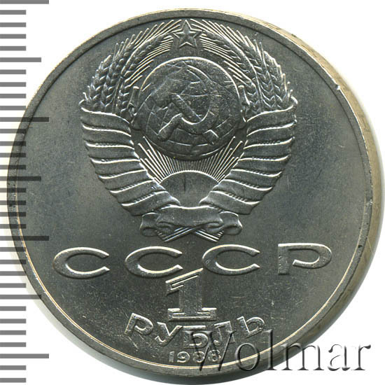 Сверху герб СССР с 15 витками ленты, под ним буквы «СССР», ниже обозначение достоинства монеты цифра «1» и ниже слово «РУБЛЬ», внизу у канта год выпуска монеты «1988».