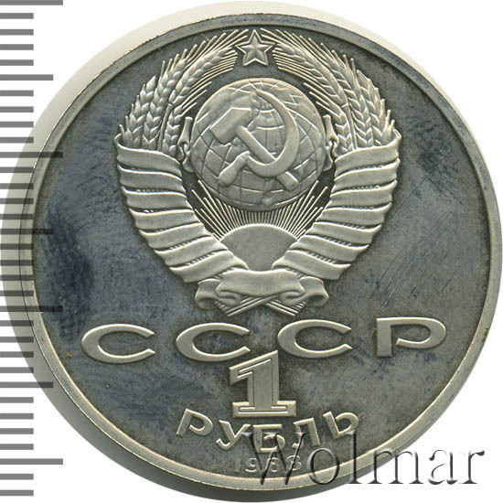 Сверху герб СССР с 15 витками ленты, под ним буквы «СССР», ниже обозначение достоинства монеты цифра «1» и ниже слово «РУБЛЬ», внизу у канта год выпуска монеты «1988».