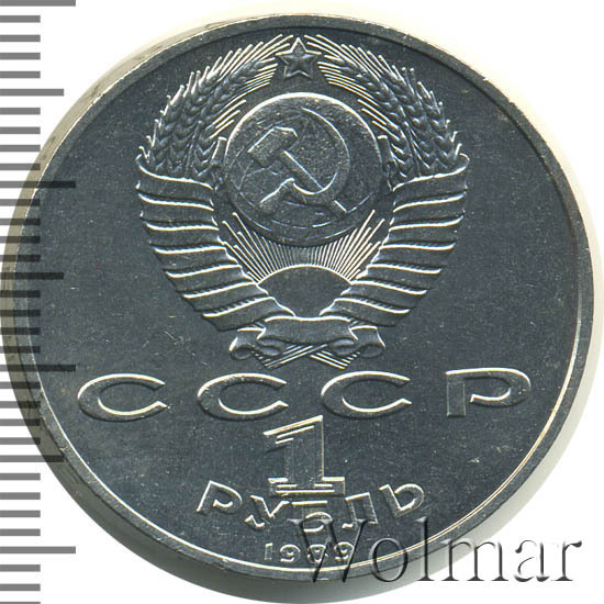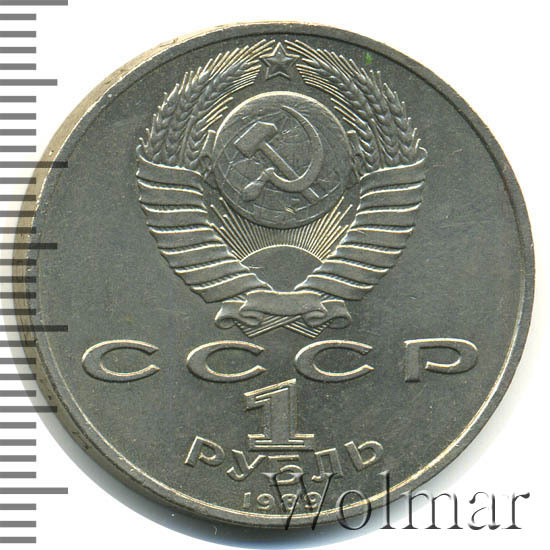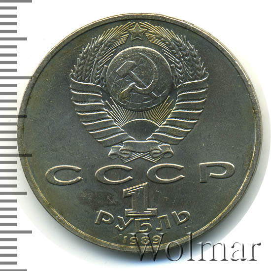 Сверху герб СССР с 15 витками ленты, под ним буквы «СССР», ниже обозначение достоинства монеты цифра «1» и ниже слово «РУБЛЬ», внизу у канта год выпуска монеты «1989».