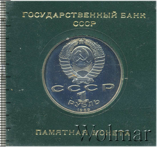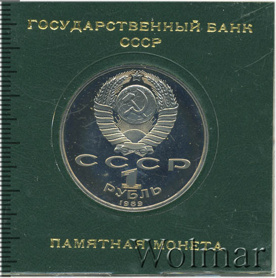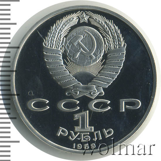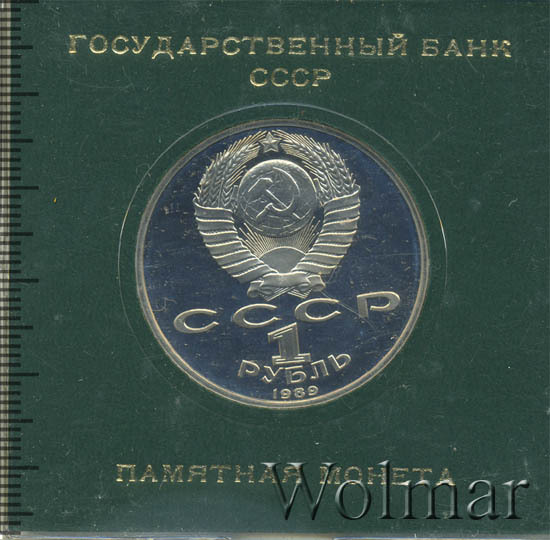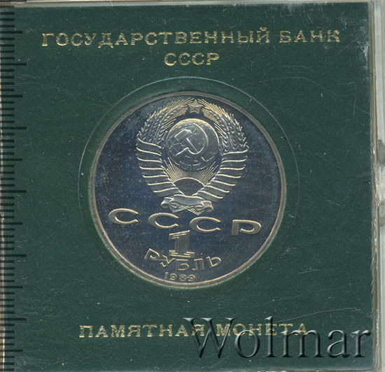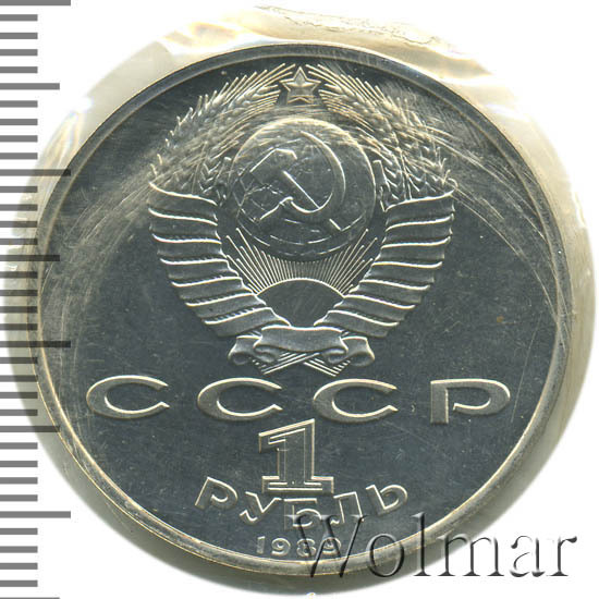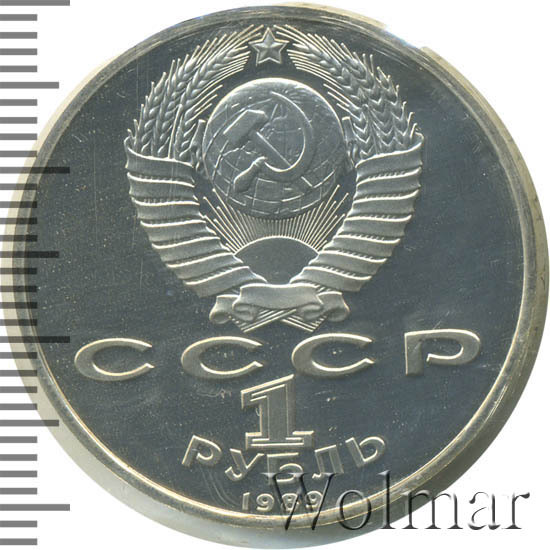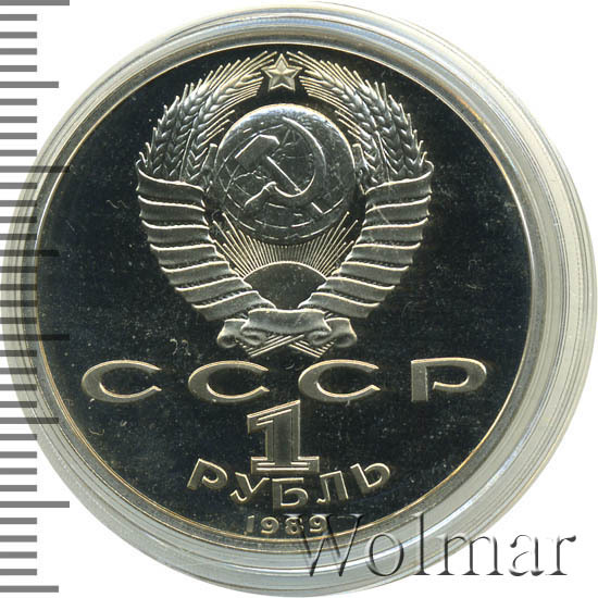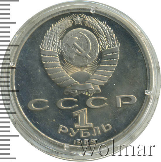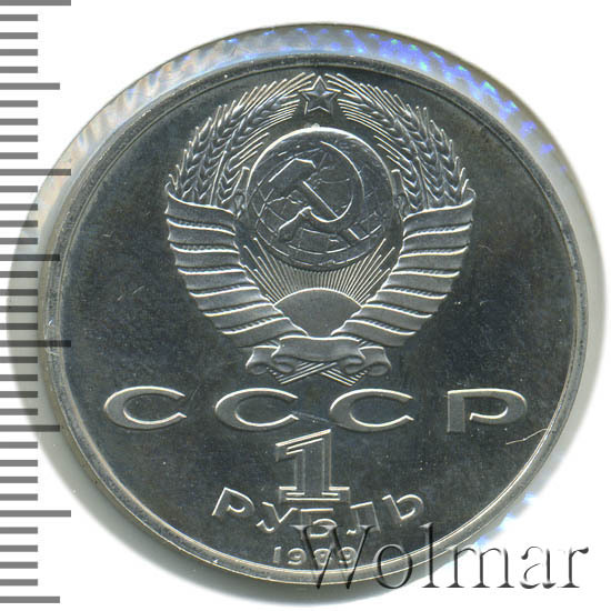 Сверху герб СССР с 15 витками ленты, под ним буквы «СССР», ниже обозначение достоинства монеты цифра «1» и ниже слово «РУБЛЬ», внизу у канта год выпуска монеты «1989».