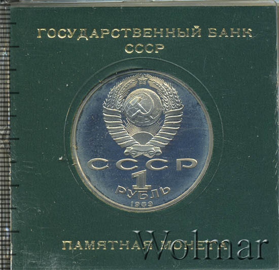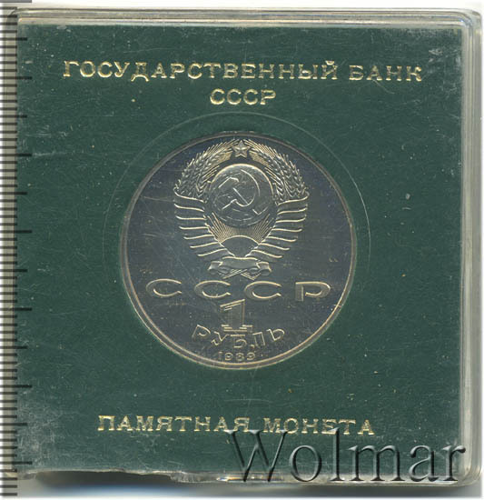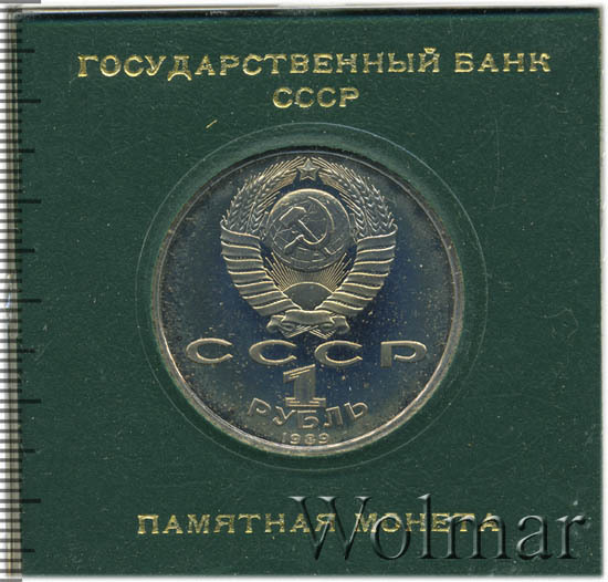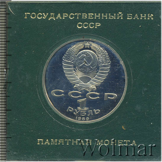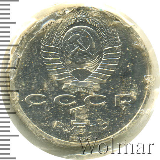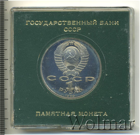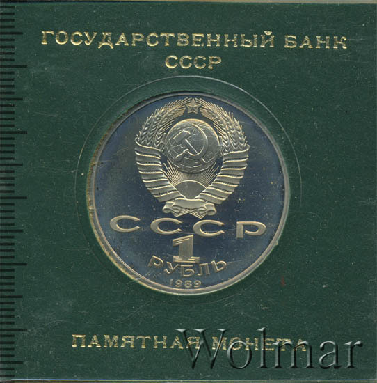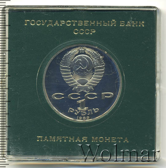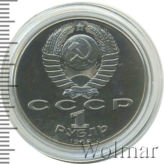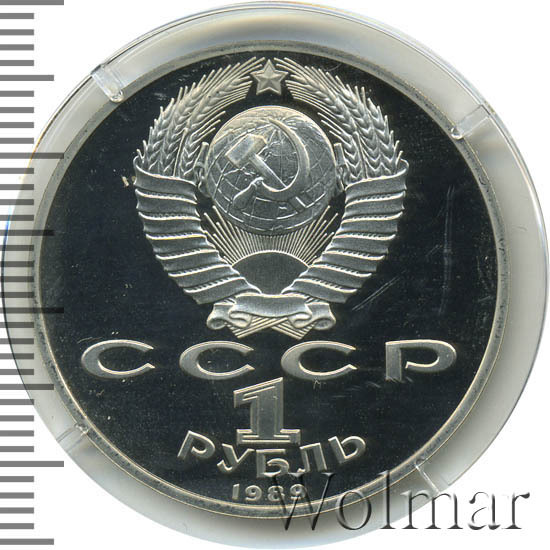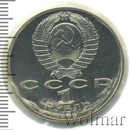 Сверху герб СССР с 15 витками ленты, под ним буквы «СССР», ниже обозначение достоинства монеты цифра «1» и ниже слово «РУБЛЬ», внизу у канта год выпуска монеты «1989».