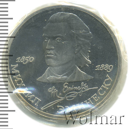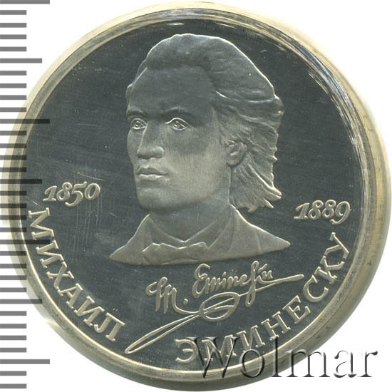 В центре портрет М. Эминеску. Слева от него год рождения «1850», справа - год смерти «1889». Под портретом факсимильная подпись, а ещё ниже вдоль внешнего ободка монеты полукругом надпись «МИХАИЛ ЭМИНЕСКУ».