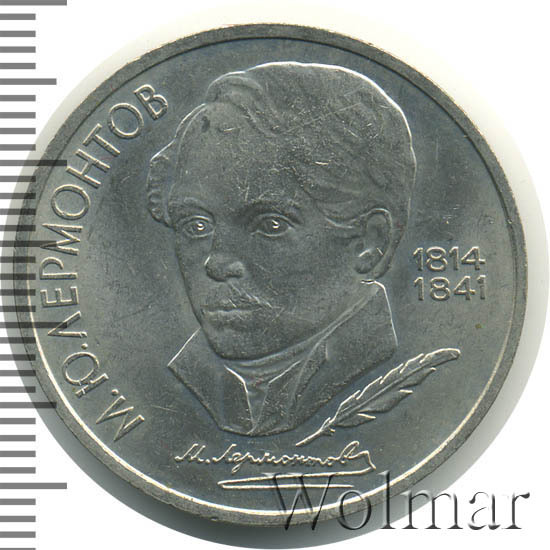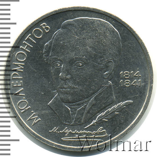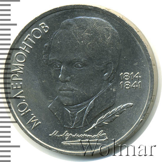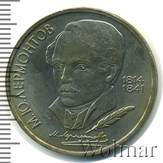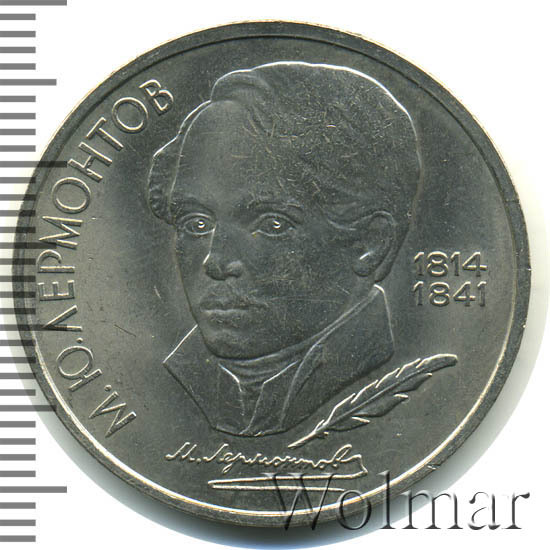 К 175 летнему юбилею со дня рождения русского офицера, поэта и художника Михаила Юрьевича Лермонтова была отчеканена памятная монета 1 рубль. Заявленный тираж вполне обычный, составил 3 миллиона, из которых 300 тысяч штук изготовлены в качестве proof. Молодой поэт творил во время золотого века русской поэзии, его произведения отличаются энегрией, выразительностью и красотой слога. Существует даже такая наука, как лермонтоведение, изучающая творчество этого русского классика. В Пензенской области, в селе Лермонтово находится музей поэта, другой музей расположен в Пятигорске, где Михаил Юрьевич провёл последние годы жизни.