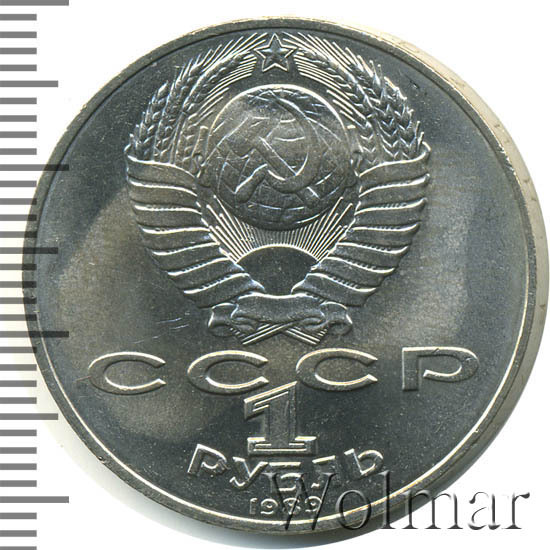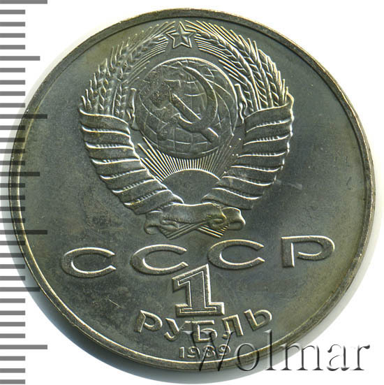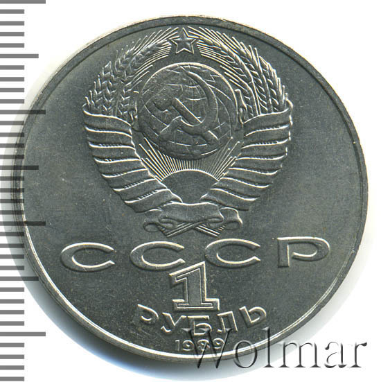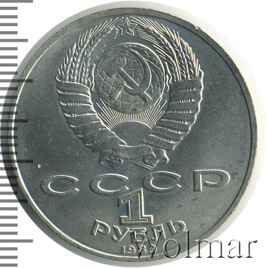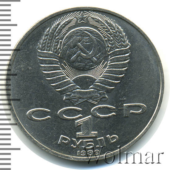 Сверху герб СССР с 15 витками ленты, под ним буквы «СССР», ниже обозначение достоинства монеты цифра «1» и ниже слово «РУБЛЬ», внизу у канта год выпуска монеты «1989».
