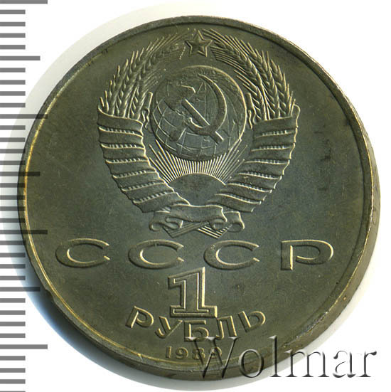 Сверху герб СССР с 15 витками ленты, под ним буквы «СССР», ниже обозначение достоинства монеты цифра «1» и ниже слово «РУБЛЬ», внизу у канта год выпуска монеты «1989».