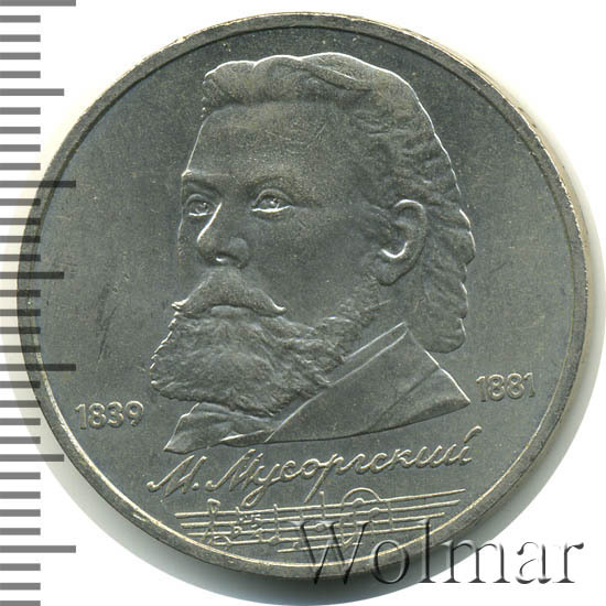 К 150 летнему юбилею со дня рождения выдающегося русского композитора Модеста Петровича Мусоргского была выпущена памятная медно-никелевая монета в 1 рубль. Заявленный тираж вполне обычный, составил порядка 3-х миллионов штук, 300 тысяч из которых изготовлены в улучшенном качеством proof.