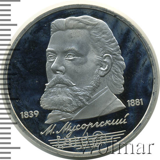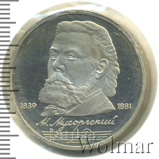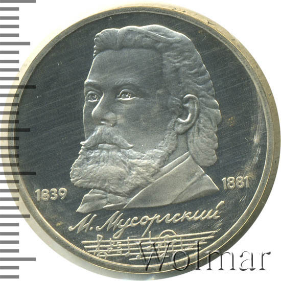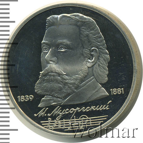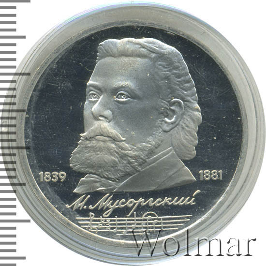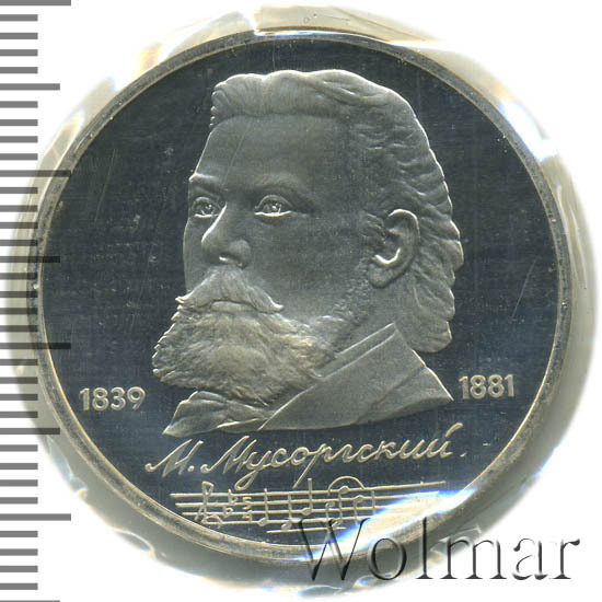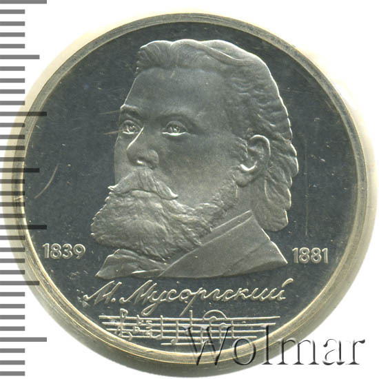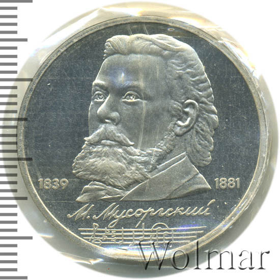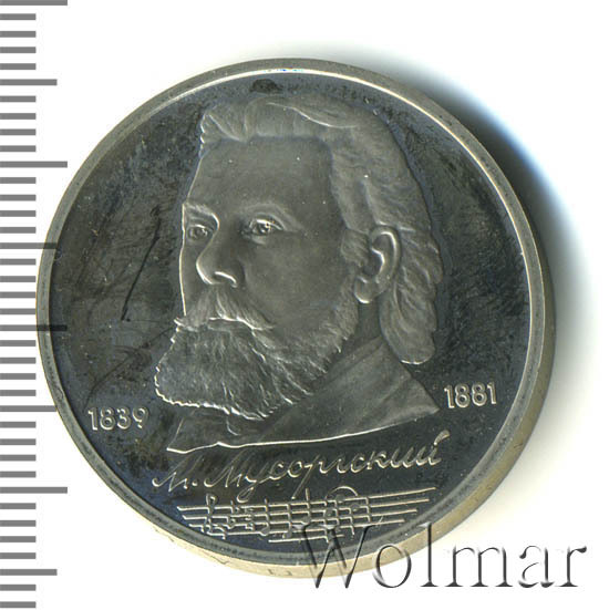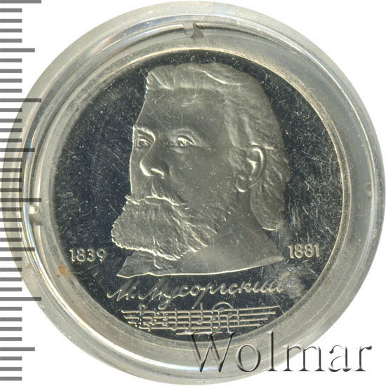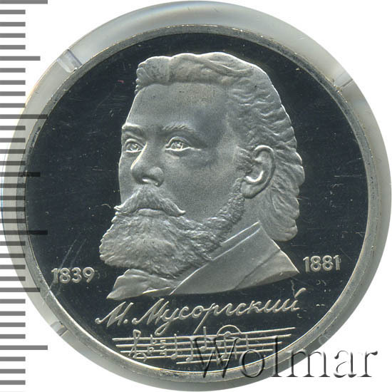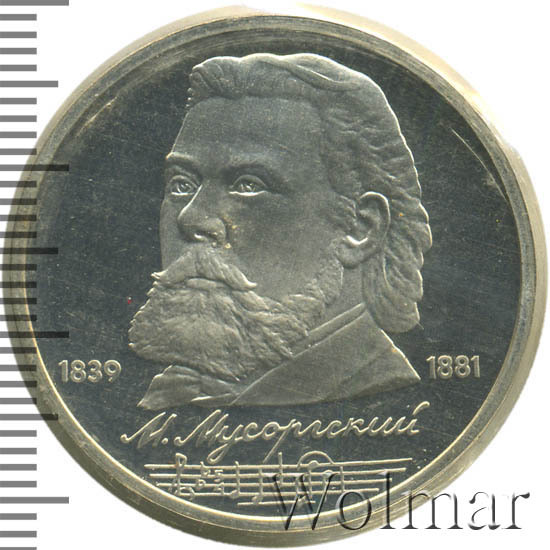 Стоимость 1 рубля 1989 года М.П.Мусоргский proof всего в два-три раза дороже стоимости обычной юбилейной монеты, посвящённой композитору. На странице ниже приведены подробные сведения и цены на 1 рубль 1989 150 лет М.П.Мусоргскому.