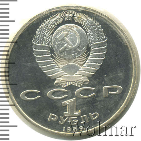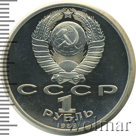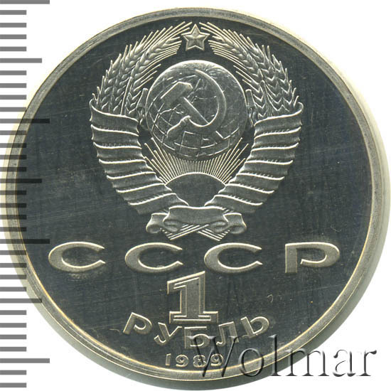 Сверху герб СССР с 15 витками ленты, под ним буквы «СССР», ниже обозначение достоинства монеты цифра «1» и ниже слово «РУБЛЬ», внизу у канта год выпуска монеты «1989».