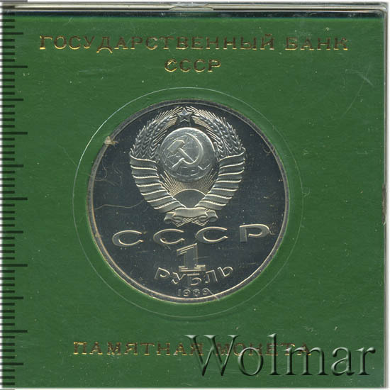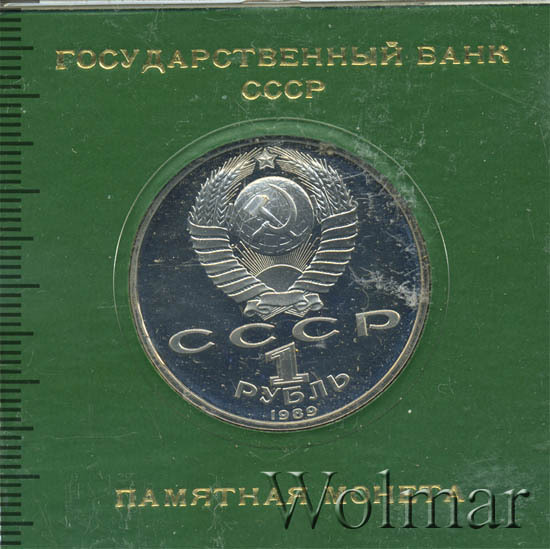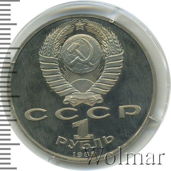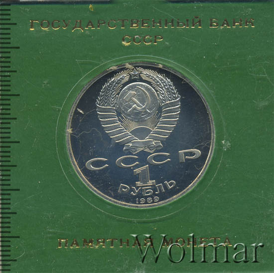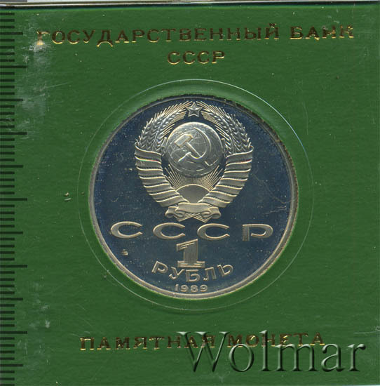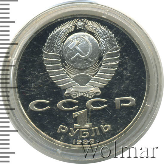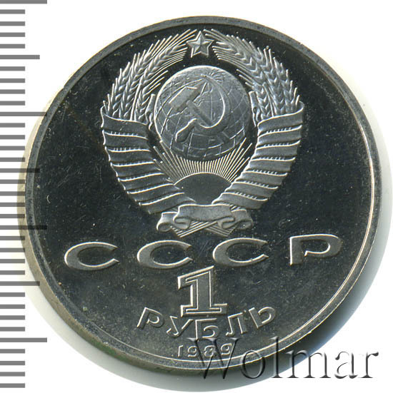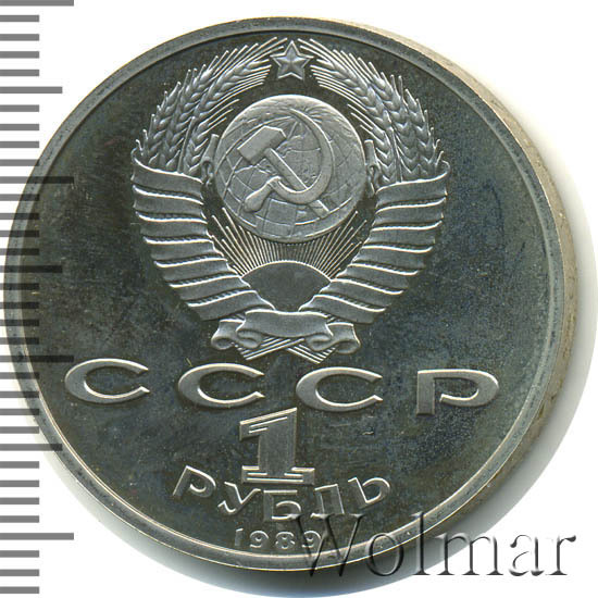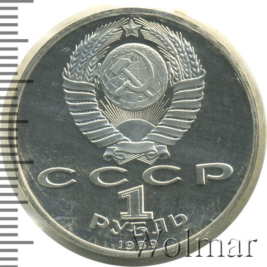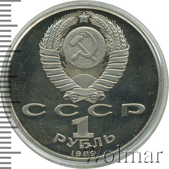 Сверху герб СССР с 15 витками ленты, под ним буквы «СССР», ниже обозначение достоинства монеты цифра «1» и ниже слово «РУБЛЬ», внизу у канта год выпуска монеты «1989».