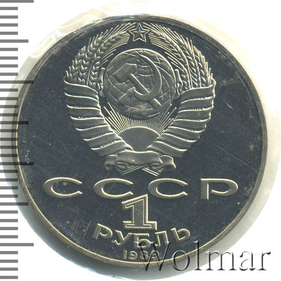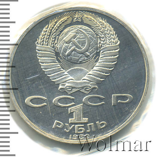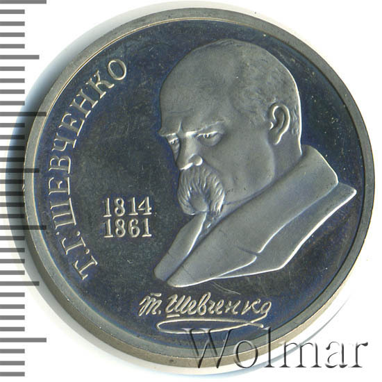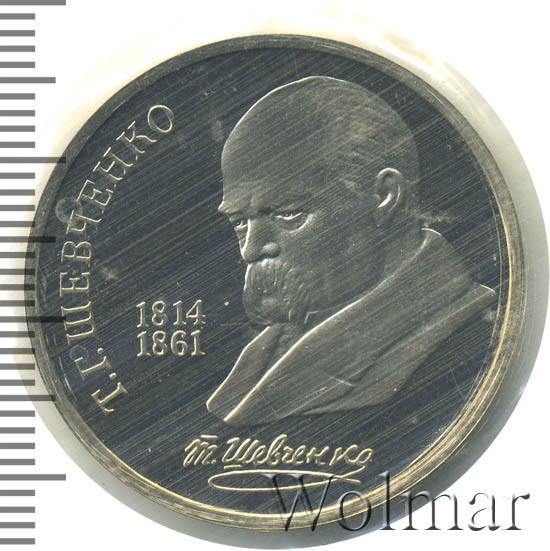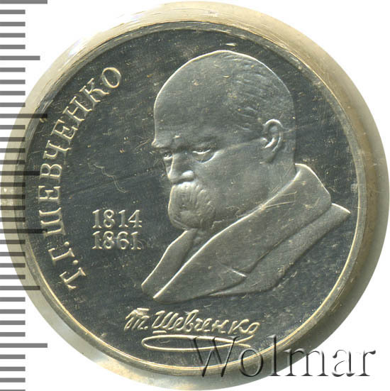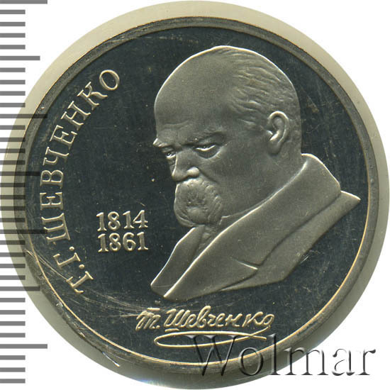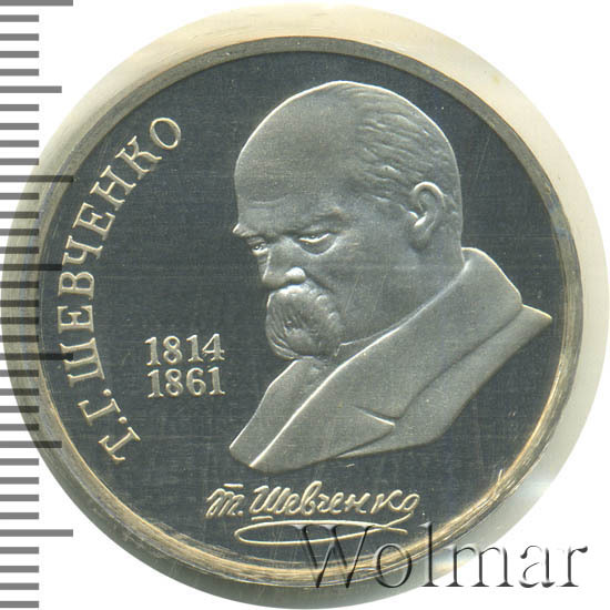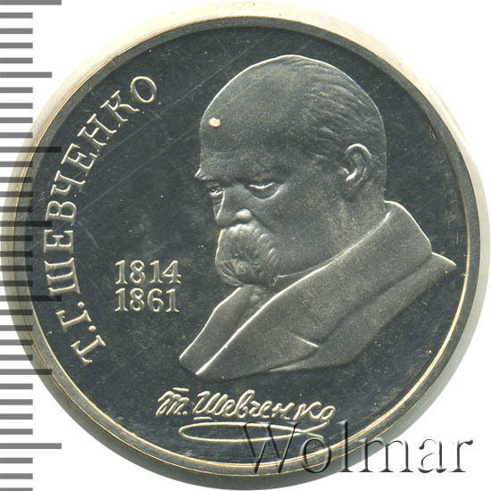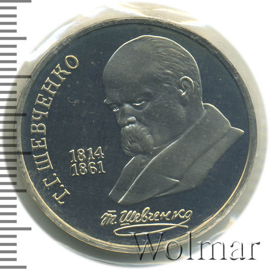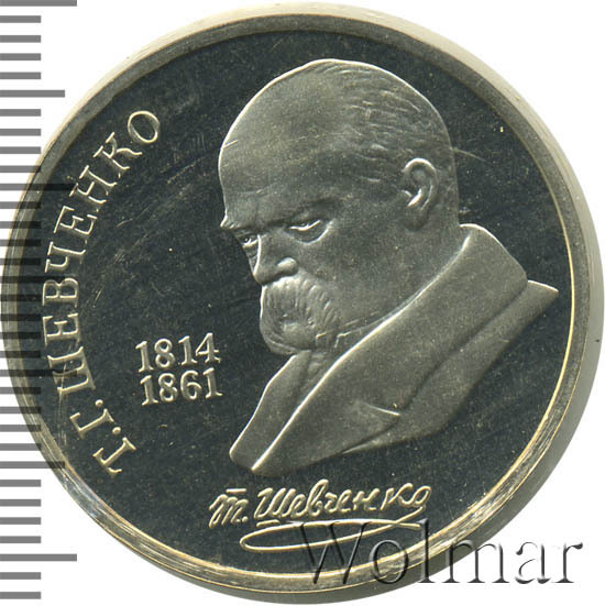1 рубль 1989, посвящённый 175-ти летию выдающегося украинского поэта, прозаика и художника Тараса Григорьевича Шевченко был по традиции отчеканен в улучшенном качестве proof. Объём выпуска составил порядка 300 тысяч штук, а 2,7 млн. экземпляров были изготовлены в обычном качестве для нужд денежного оборота. В царской России поэта признавали, но не чествовали из-за его крамольных революционных и националистских взглядов. С началом компании по культурной коренизации в СССР в 20-30х годах ХХ века, с принятием проекта монументальной пропаганды начинается массовое увековечивание памяти, в том числе и о Т.Г.Шевченко, дабы сгладить национальные противоречия в республиках и автономиях.