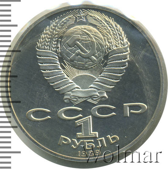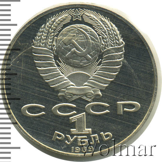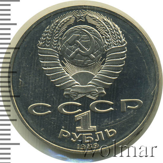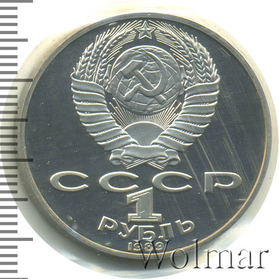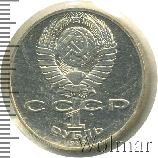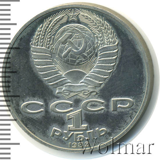 Сверху герб СССР с 15 витками ленты, под ним буквы «СССР», ниже обозначение достоинства монеты цифра «1» и ниже слово «РУБЛЬ», внизу у канта год выпуска монеты «1989».