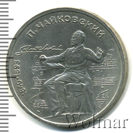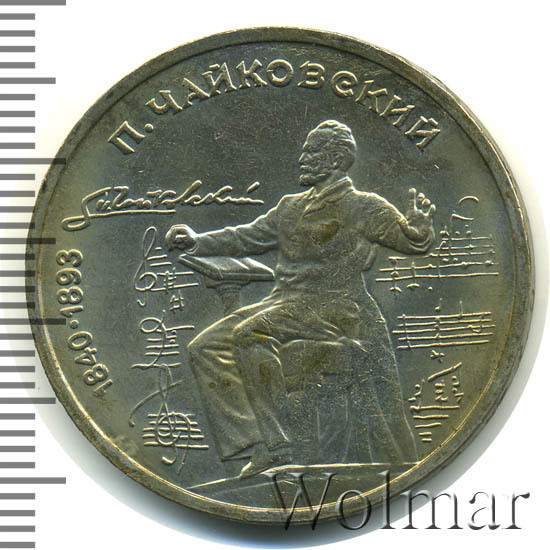 1 рубль, посвящённый 150-ти летию со дня рождения Петра Ильича Чайковского был отчеканен в 1990г., тиражом порядка 3 млн. экземпляров, 400 тыс. из которых были изготовлены в улучшенном качестве Proof. Величайший композитор с мировым именем, автор выдающихся симфоний, балетов "Лебединое озеро" и "Щелкунчик" он оказал своим творчеством огромное влияние на музыкальную культуру ХХ века. Его произведения столь талантливы и популярны, что и по сей день продолжают вдохновлять современных музыкантов на написание шлягеров, звучат в рекламных роликах или на звонках мобильных телефонов.