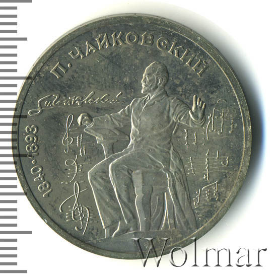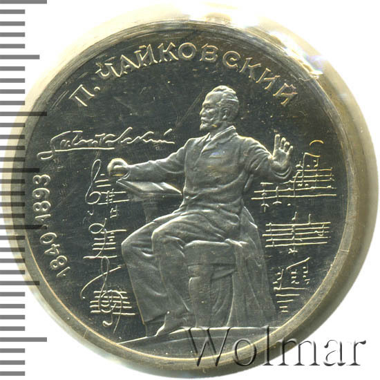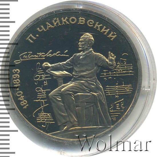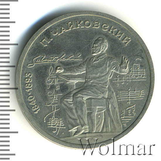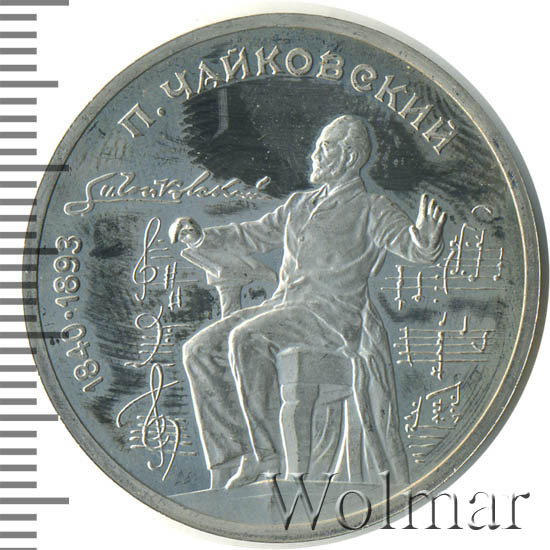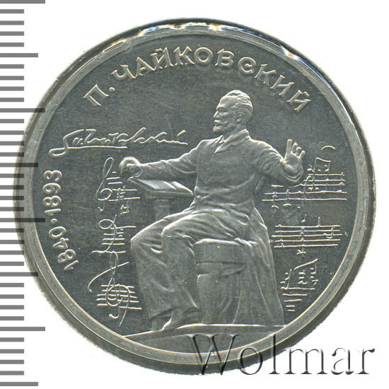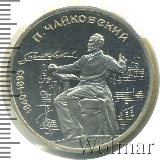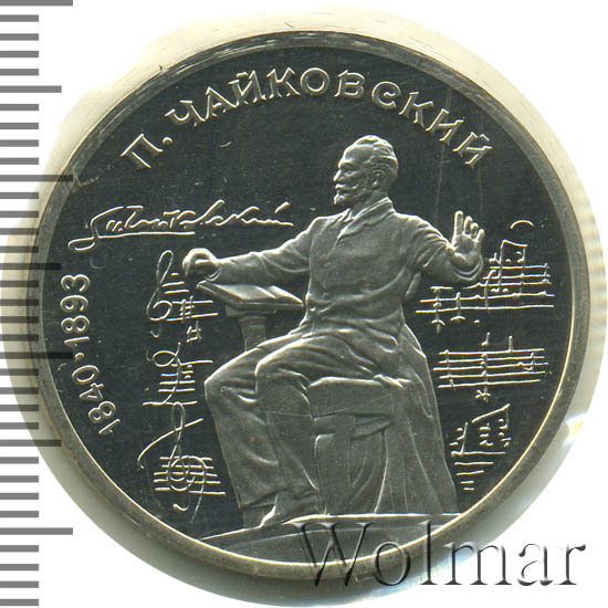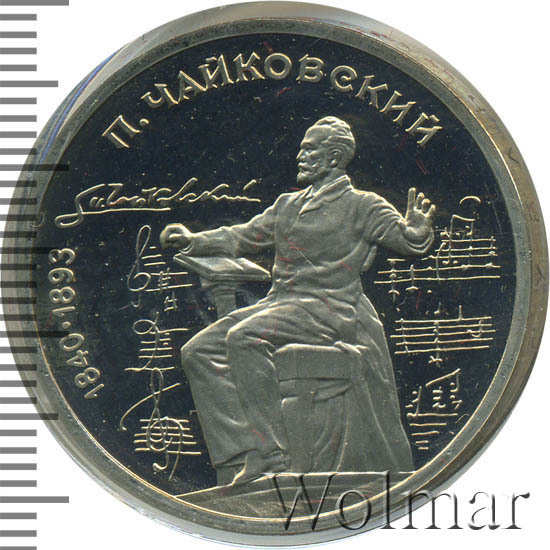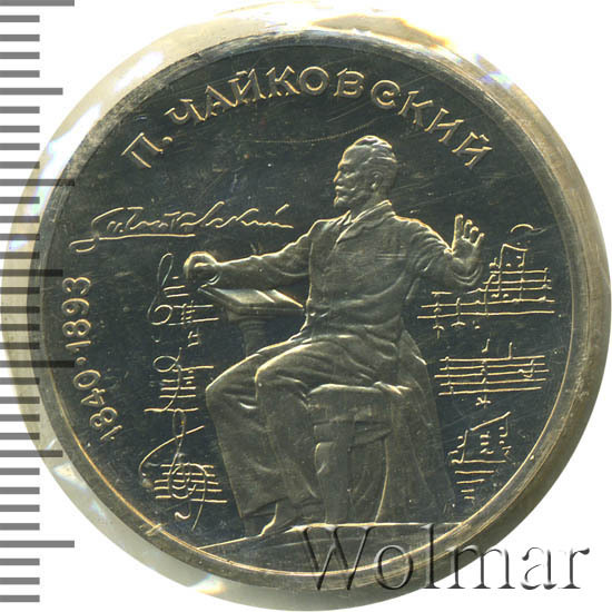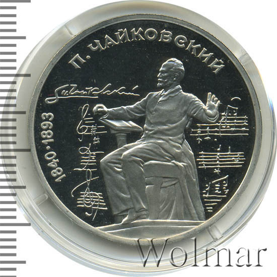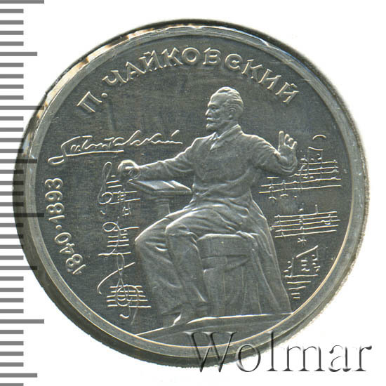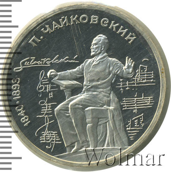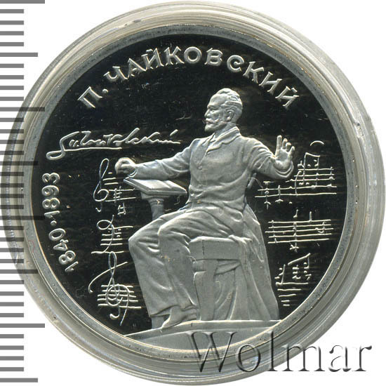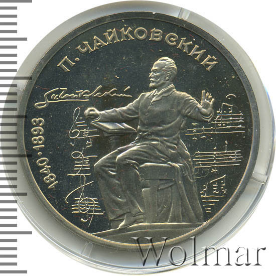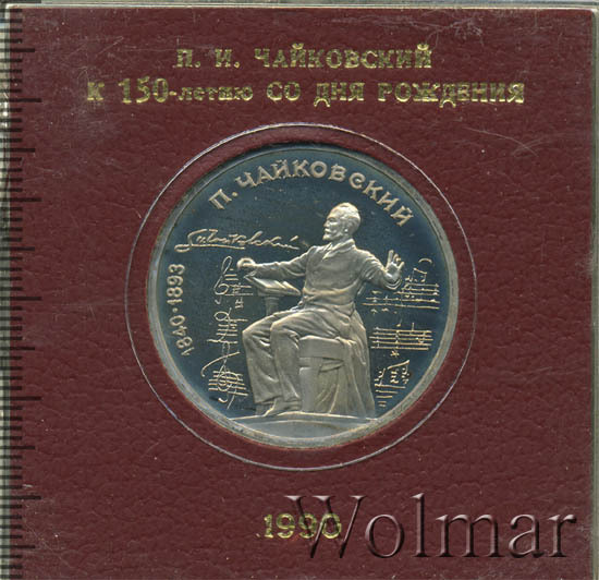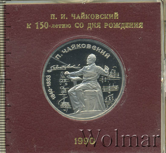 1 рубль 1990, посвященный 150-ти летию П.И. Чайковского, был изготовлен специально для коллекционеров в качестве Proof. Данная технология предполагает чеканку улучшенными полированными штемпелями на зеркальном поле монеты матового рельефа с высокой чёткостью самых мелких деталей рисунка. Поскольку монеты пруф предназначены для коллекционеров, рубли подобного качества требуют особо аккуратного обращения.