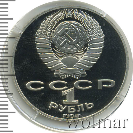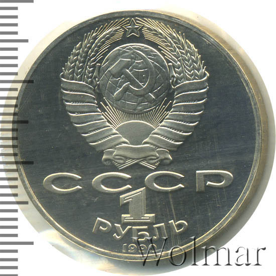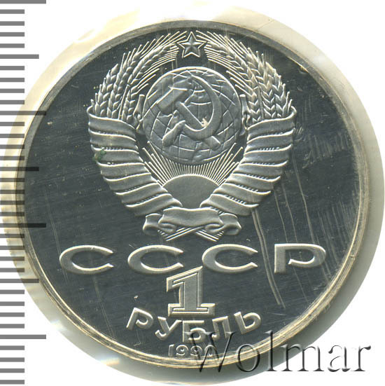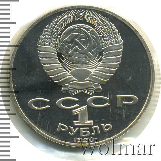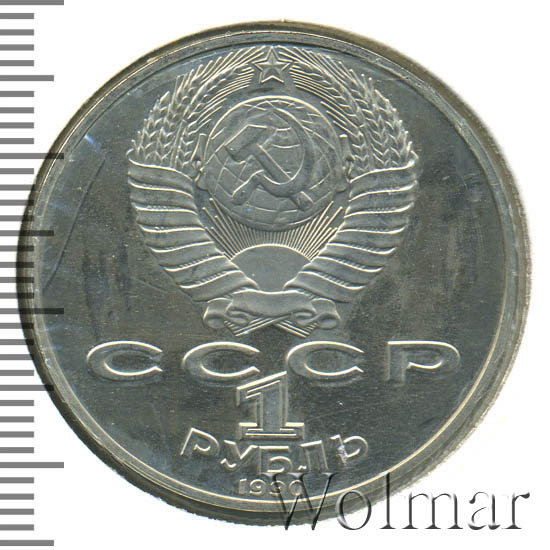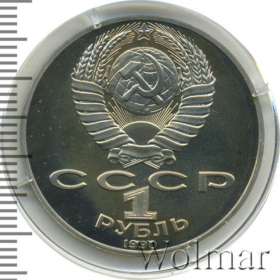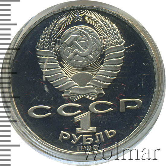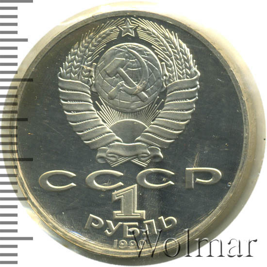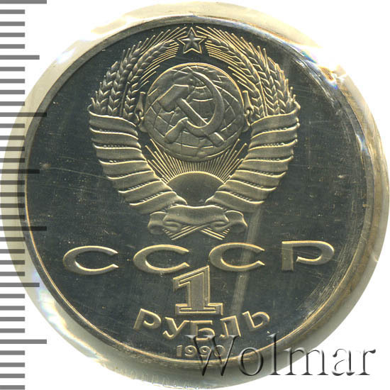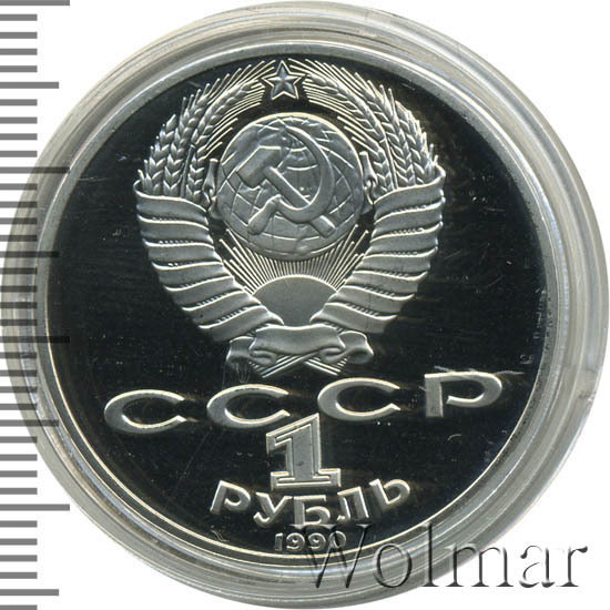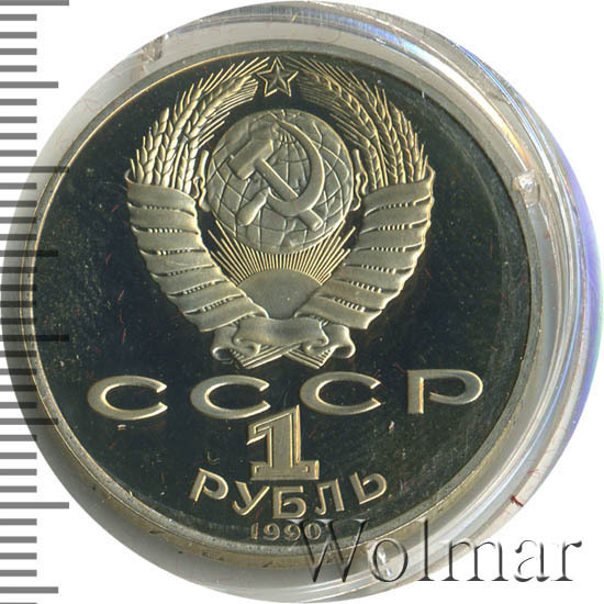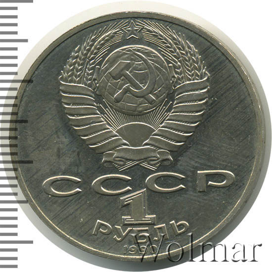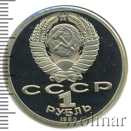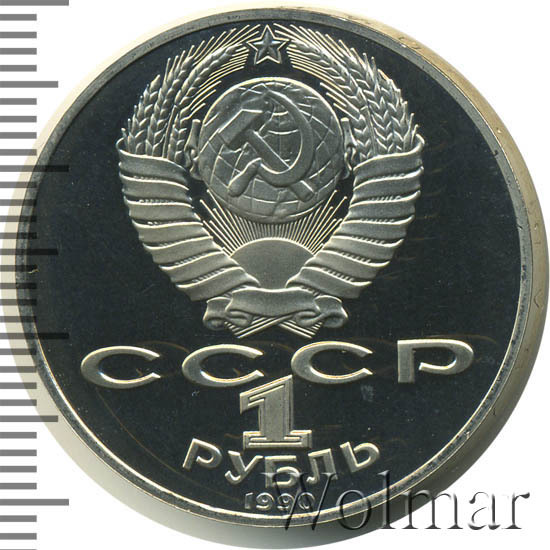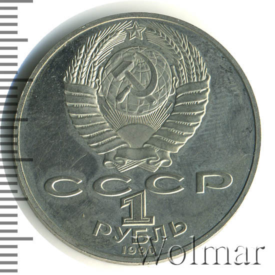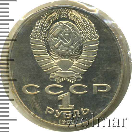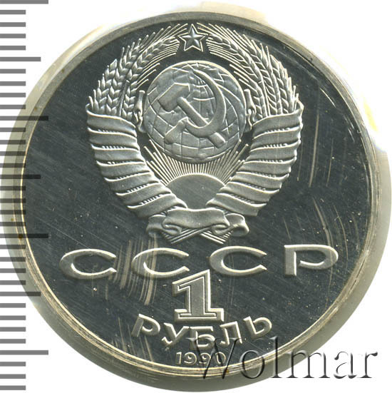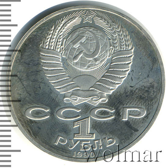Сверху герб СССР с 15 витками ленты, под ним буквы «СССР», ниже обозначение достоинства монеты цифра «1» и ниже слово «РУБЛЬ», внизу у канта год выпуска монеты «1990».
