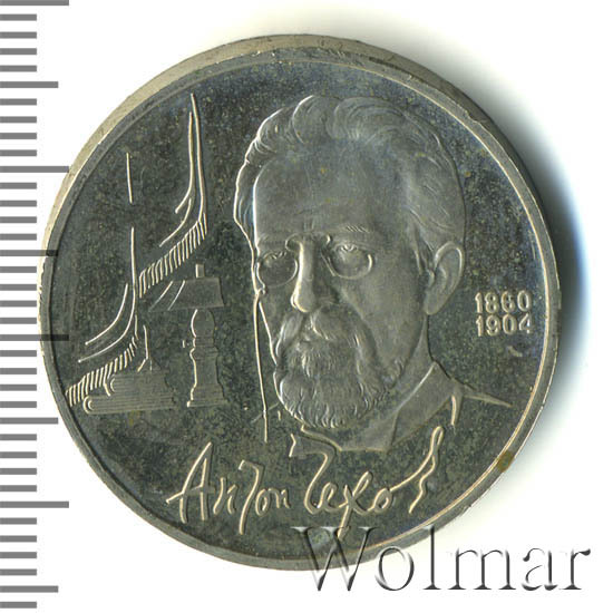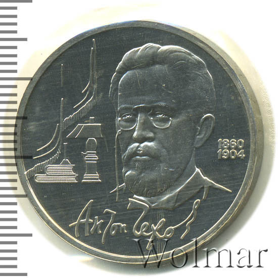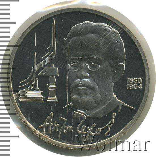 1 рубль 1990, посвященный 130-ти летию со дня рождения А.П.Чехова, был изготовлен специально для коллекционеров в качестве Proof. Данная технология предполагает чеканку улучшенными полированными штемпелями на зеркальном поле монеты матового рельефа с высокой чёткостью самых мелких деталей рисунка. Антон Павлович Чехов по праву считается классиком мировой драматургии, его знаменитые пьесы "Чайка", "Три сестры", "Вишневый сад" и другие пережили целое столетие театральных постановок и по сей день не теряют своей актуальности и драматизма.
