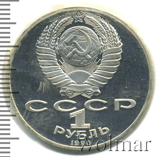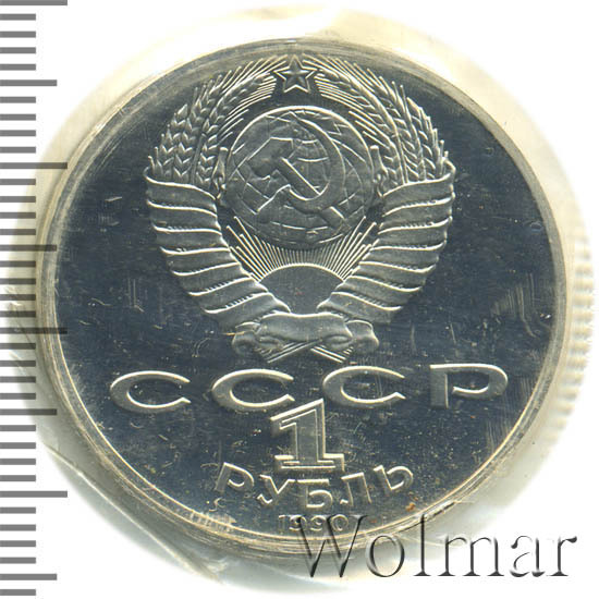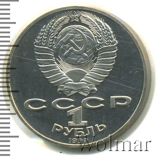 Сверху герб СССР с 15 витками ленты, под ним буквы «СССР», ниже обозначение достоинства монеты цифра «1» и ниже слово «РУБЛЬ», внизу у канта год выпуска монеты «1990».