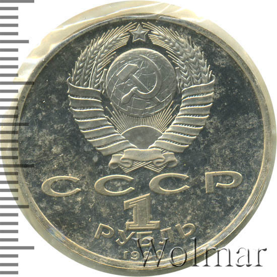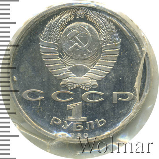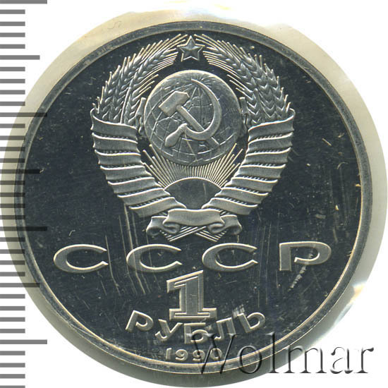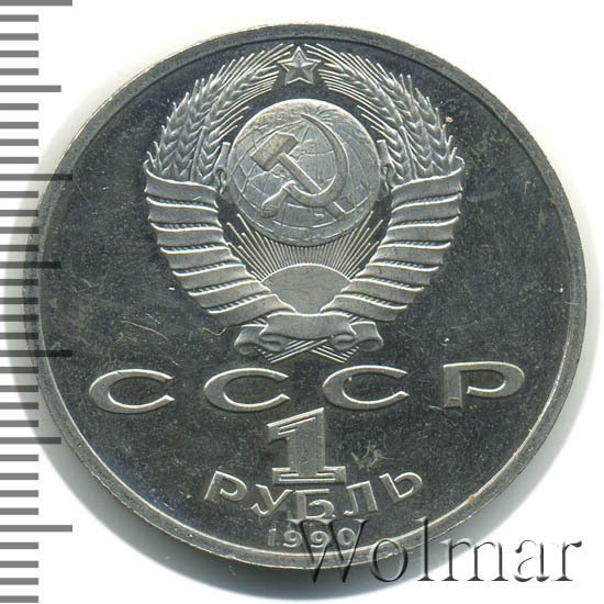 Сверху герб СССР с 15 витками ленты, под ним буквы «СССР», ниже обозначение достоинства монеты цифра «1» и ниже слово «РУБЛЬ», внизу у канта год выпуска монеты «1990».