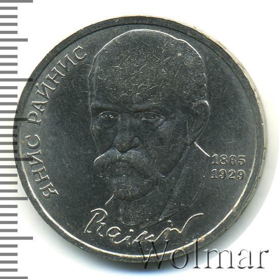 В 1990 году к 125-ти летию со дня рождения Яниса Райниса были выпущены юбилейные монеты номиналом 1 рубль, тиражом порядка 3 млн. экземпляров, 400 тыс. из которых были изготовлены в улучшенном качестве Proof. Об этом латышском писателе, поэте и драматурге нашим современникам известно, как правило, не много. Скорее всего, это связано с тем, что творчество Райниса было проникнуто идеалами революции и борьбой рабочего класса. Ещё можно сказать, что появление именно этого деятеля на памятном рубле, могло быть вызвано политическими соображениями многонационального союзного государства.