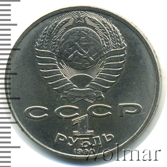 Сверху герб СССР с 15 витками ленты, под ним буквы «СССР», ниже обозначение достоинства монеты цифра «1» и ниже слово «РУБЛЬ», внизу у канта год выпуска монеты «1990».