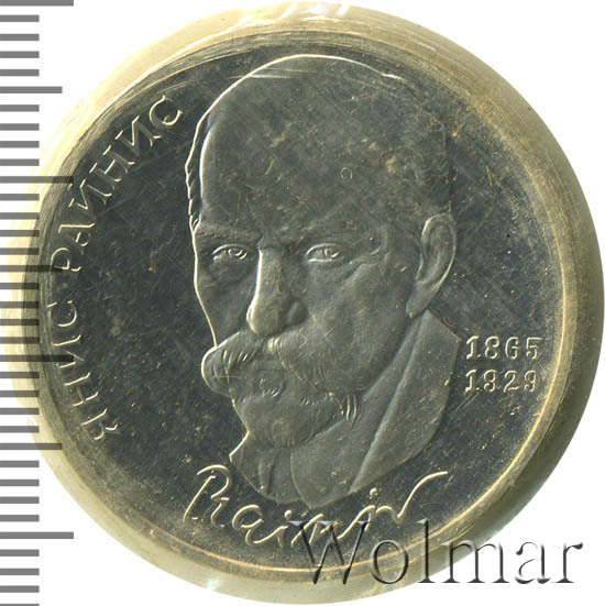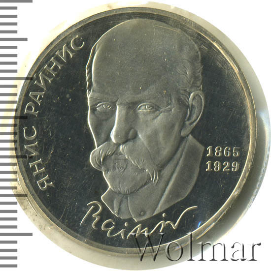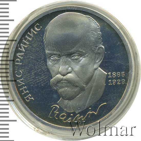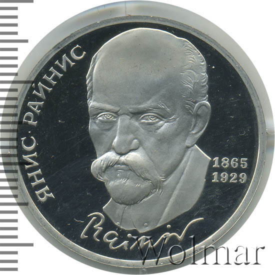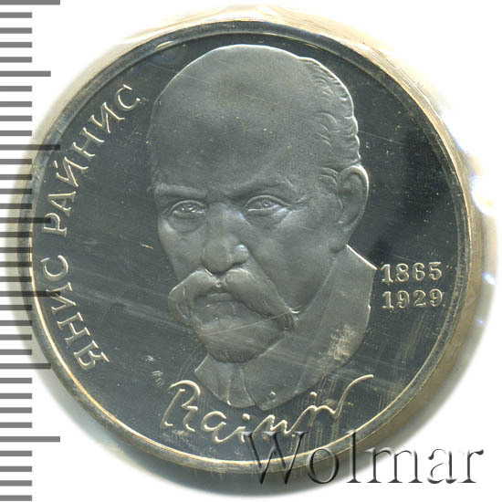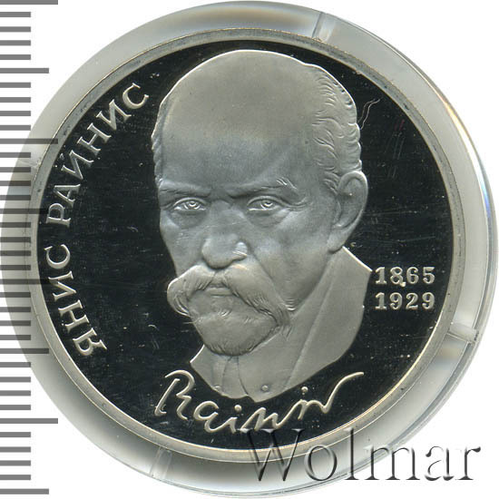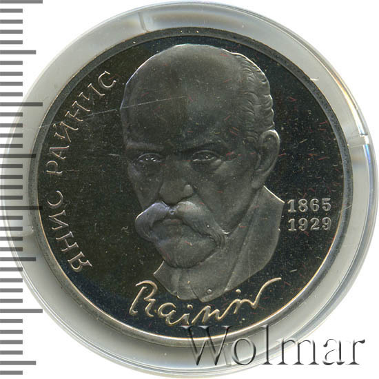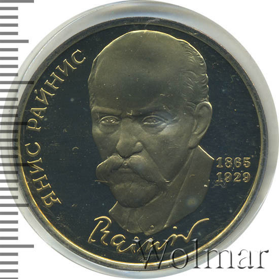1 рубль 1990г. 125 лет со дня рождения латышского писателя и драматурга Яниса Райниса, был также по традиции изготовлен и для коллекционеров в качестве Proof. Данная технология предполагает чеканку улучшенными полированными штемпелями на зеркальном поле монеты матового рельефа с высокой чёткостью самых мелких деталей рисунка. Поскольку зеркальный пруф предназначен именно для специалистов-нумизматов, монеты подобного качества требуют особо аккуратного обращения. Испортить пруф очень легко, достаточно просто взять монетку голыми пальцами без перчаток. Хранят такие изделия, как правило, в специальных капсулах или холдерах.