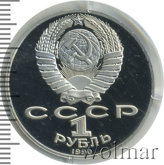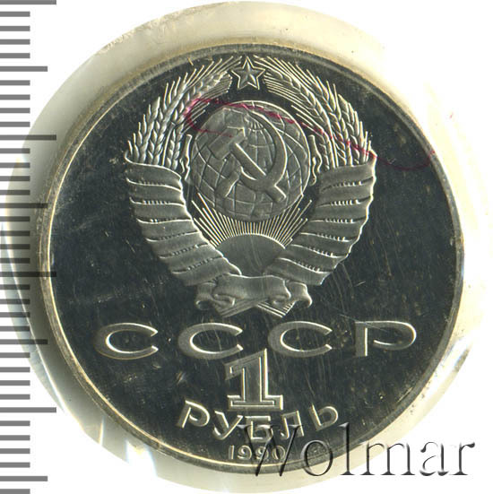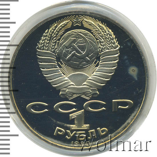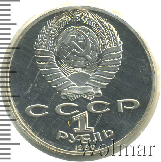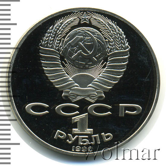 Сверху герб СССР с 15 витками ленты, под ним буквы «СССР», ниже обозначение достоинства монеты цифра «1» и ниже слово «РУБЛЬ», внизу у канта год выпуска монеты «1990».