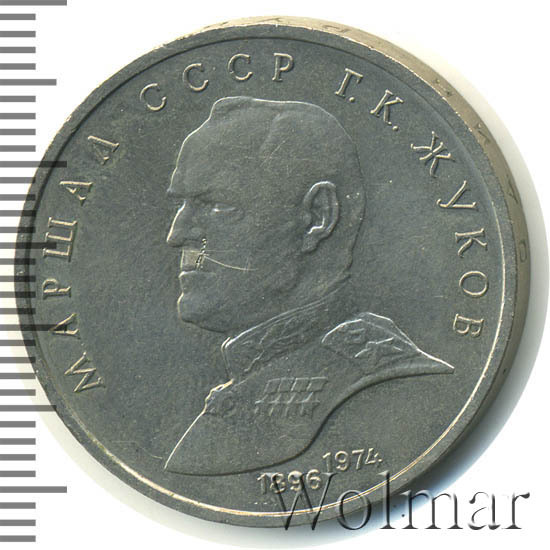 1 рубль 1990г. был отчеканен в честь 45-ти летия победы в ВОВ тиражом порядка двух миллионов штук, 400 тыс. из которых были изготовлены по технологии Proof. На реверсе юбилейной монеты был изображён профиль знаменитого полководца Георгия Константиновича Жукова. Это была четвёртая юбилейная монета СССР, посвящённая победе над гитлеровской Германией. В послевоенные годы маршал, некоторое время находился в опале, был обвинён в вывозе трофеев из оккупированной Германии, незаконном преувеличении боевых заслуг и в присвоении чужих операций. Отчасти гонения были связаны с возросшим культом личности полководца, его авторитетом в советской армии и желанием властвующей элиты убрать с политической арены столь сильного оппонента. Вопреки последней воле Г.К.Жукова и его близких, урна с прахом маршала была захоронена в Кремлёвской стене на Красной площади в 1974г.