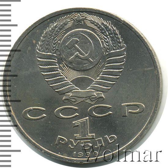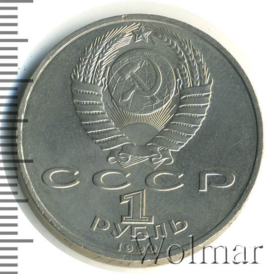 Сверху герб СССР с 15 витками ленты, под ним буквы «СССР», ниже обозначение достоинства монеты цифра «1» и ниже слово «РУБЛЬ», внизу у канта год выпуска монеты «1990».