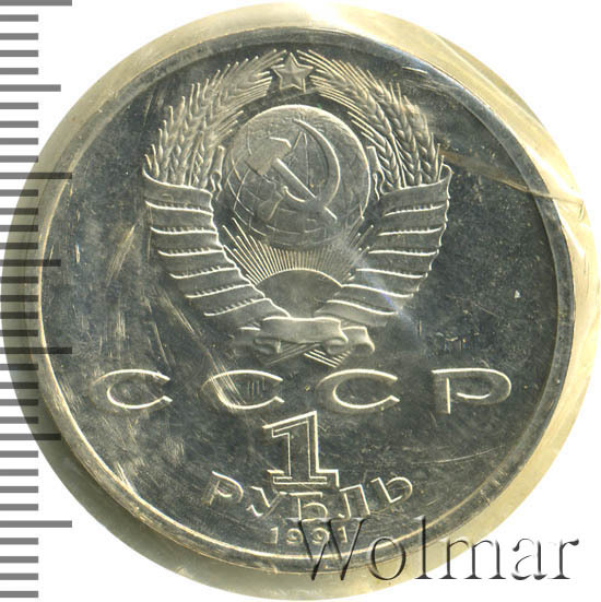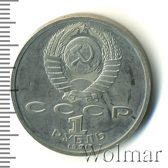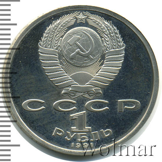 Сверху герб СССР с 15 витками ленты, под ним буквы «СССР», ниже обозначение достоинства монеты цифра «1» и ниже слово «РУБЛЬ», внизу у канта год выпуска монеты «1991».