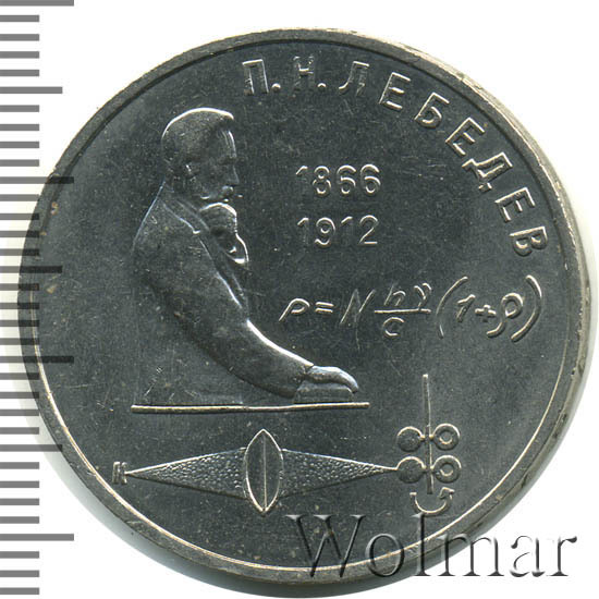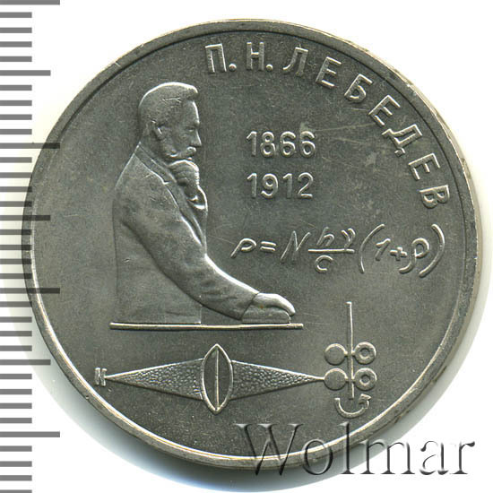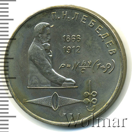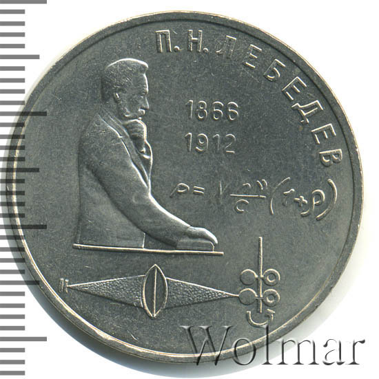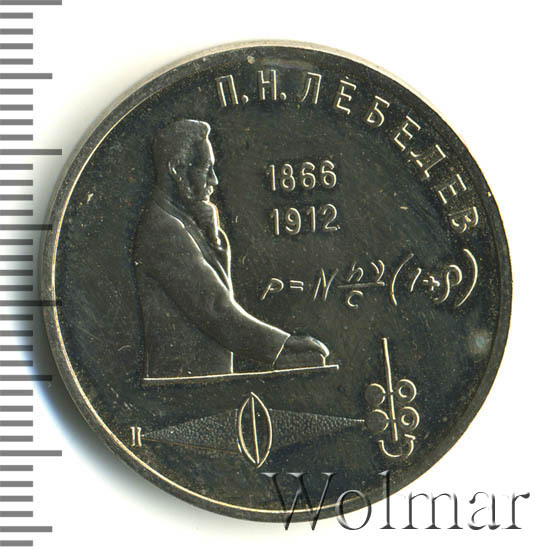 В левой части монеты боковое изображение П. Н. Лебедева. Справа от него в две строки даты «1866» и «1912», обозначающие годы жизни ученого. Под датами физическая формула давления света. В нижней части стилизованные изображения физических приборов. Сверху справа вдоль внешнего ободка монеты по окружности надпись: «П. Н. ЛЕБЕДЕВ».