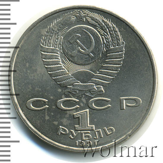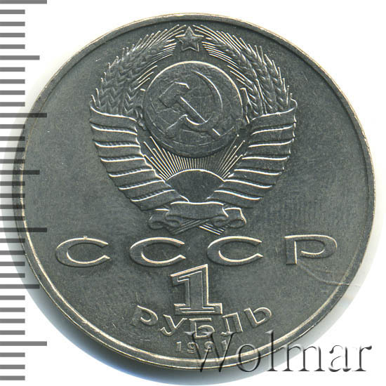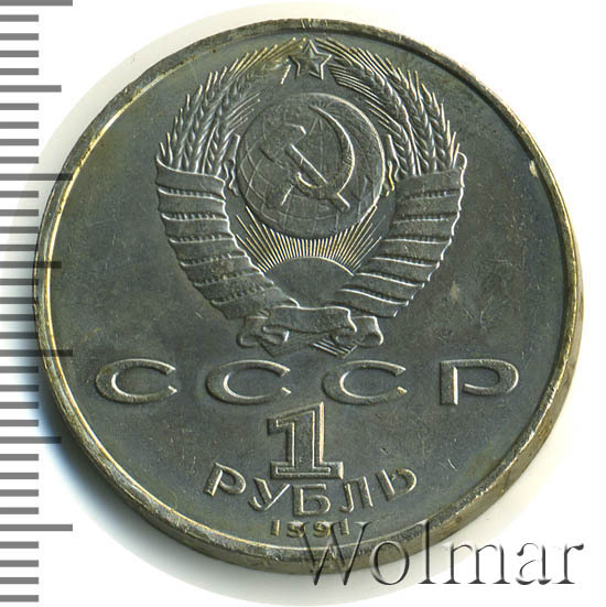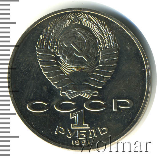 Сверху герб СССР с 15 витками ленты, под ним буквы «СССР», ниже обозначение достоинства монеты цифра «1» и ниже слово «РУБЛЬ», внизу у канта год выпуска монеты «1991».