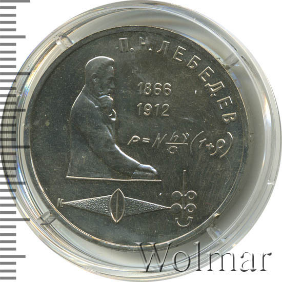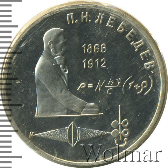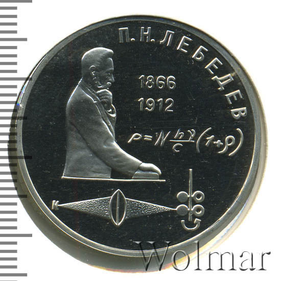 В левой части монеты боковое изображение П. Н. Лебедева. Справа от него в две строки даты «1866» и «1912», обозначающие годы жизни ученого. Под датами физическая формула давления света. В нижней части стилизованные изображения физических приборов. Сверху справа вдоль внешнего ободка монеты по окружности надпись: «П. Н. ЛЕБЕДЕВ».