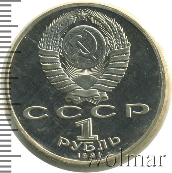 Сверху герб СССР с 15 витками ленты, под ним буквы «СССР», ниже обозначение достоинства монеты цифра «1» и ниже слово «РУБЛЬ», внизу у канта год выпуска монеты «1991».