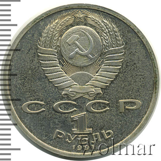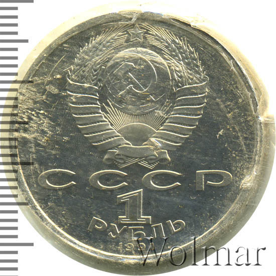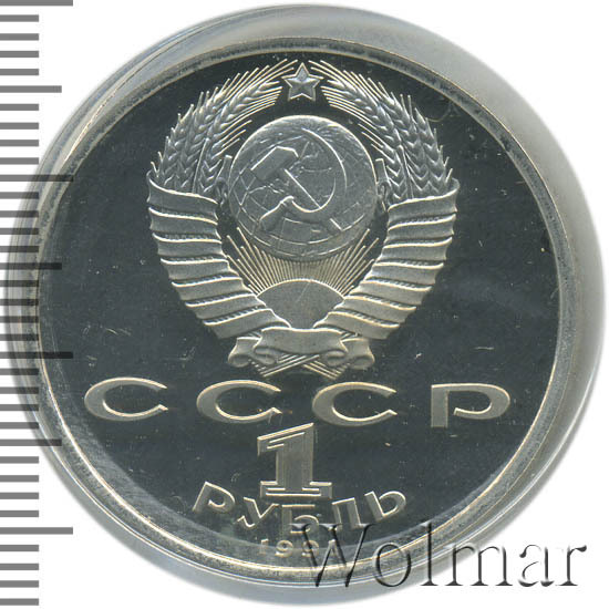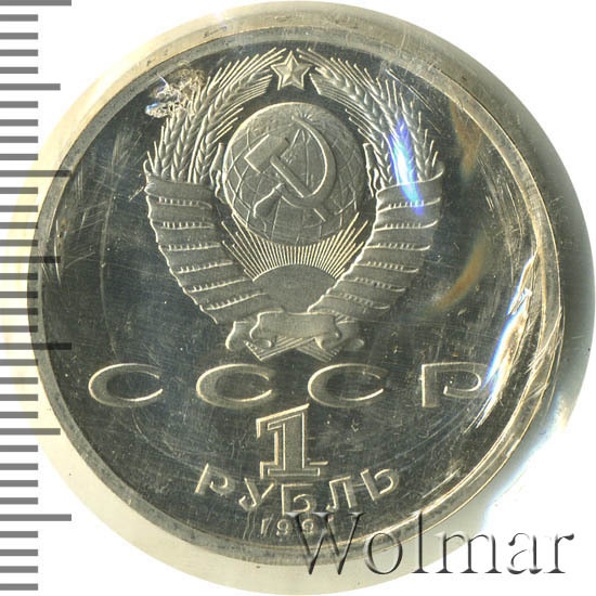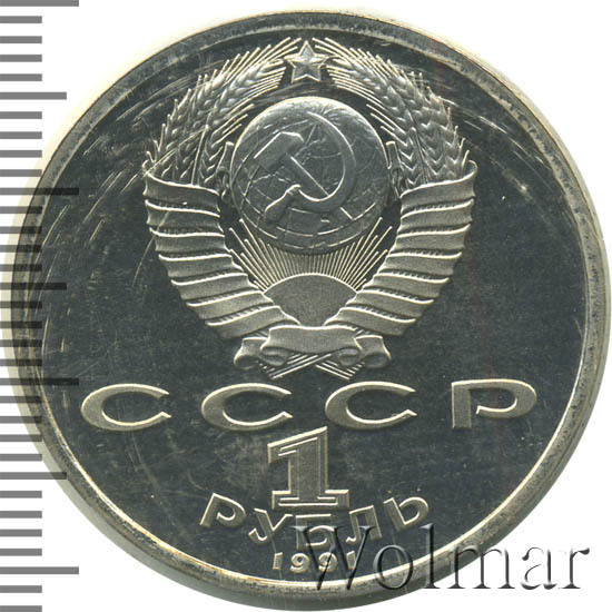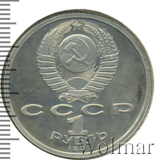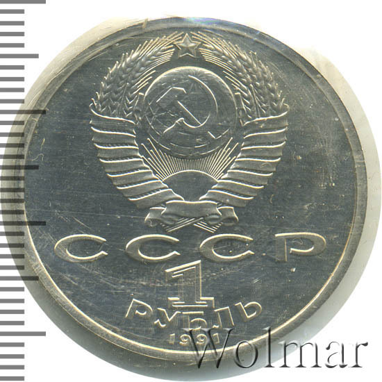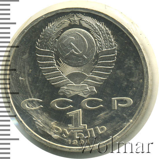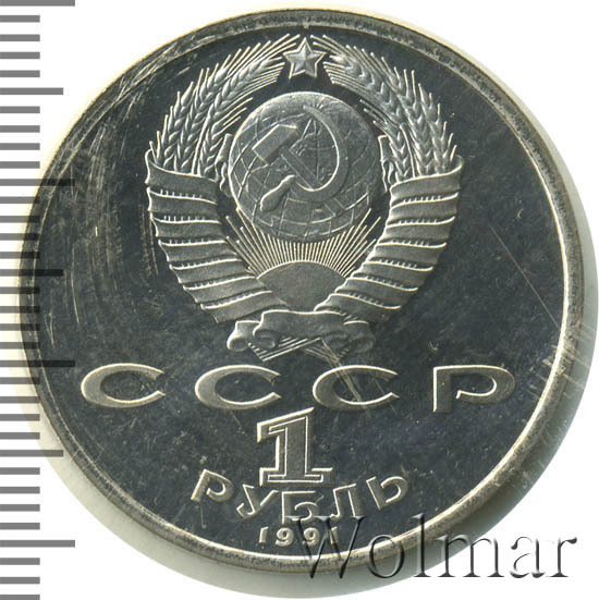 Сверху герб СССР с 15 витками ленты, под ним буквы «СССР», ниже обозначение достоинства монеты цифра «1» и ниже слово «РУБЛЬ», внизу у канта год выпуска монеты «1991».