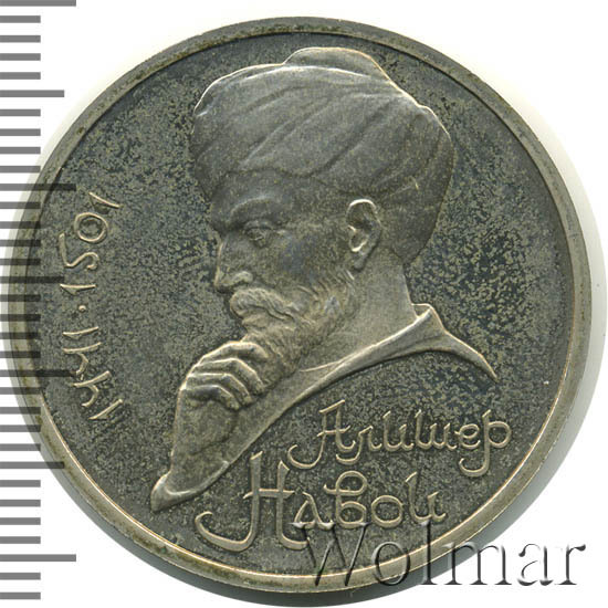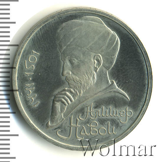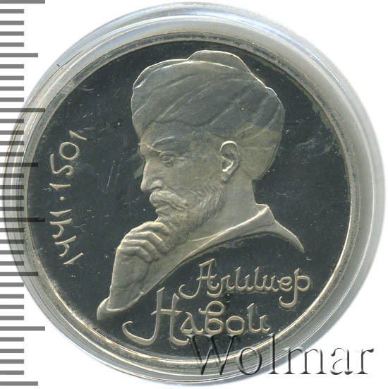 В центре портрет А. Навои. Слева от него вдоль внешнего ободка монеты полукругом приведены годы жизни поэта «1441» и «1501», разделенные точкой. Под портретом в две строки надпись «АЛИШЕР НАВОИ».
